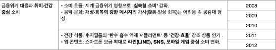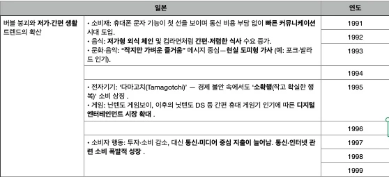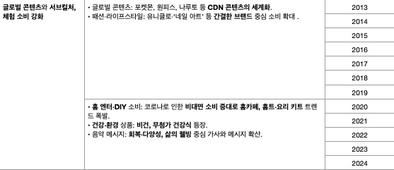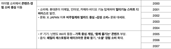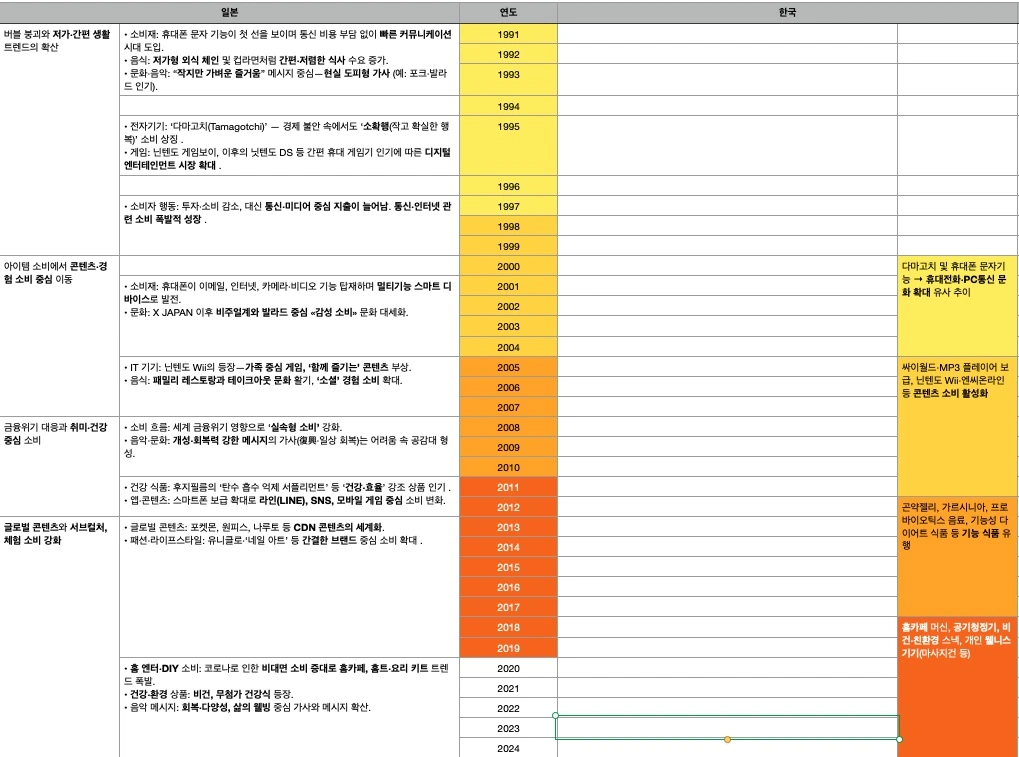 첫째, 일본은 버블 붕괴 이후 장기적인 저성장 국면에 진입하며 '경험'과 '콘텐츠' 중심의 소비로 이행했다. 둘째, 글로벌 콘텐츠에 대한 수요가 증가하면서 삶의 질, 건강, 환경을 중심으로 한 소비 트렌드가 강세를 띠었다. 셋째, 음악과 엔터테인먼트에서도 흐름이 있었는데, 90년대 일본이 현실도피형 감성 발라드가 중심이었다면, 한국은 7~8년 뒤인 2010년대 초 자아 회복과 다양성을 강조하는 메시지 중심의 OST와 자립 서사가 부상했다.