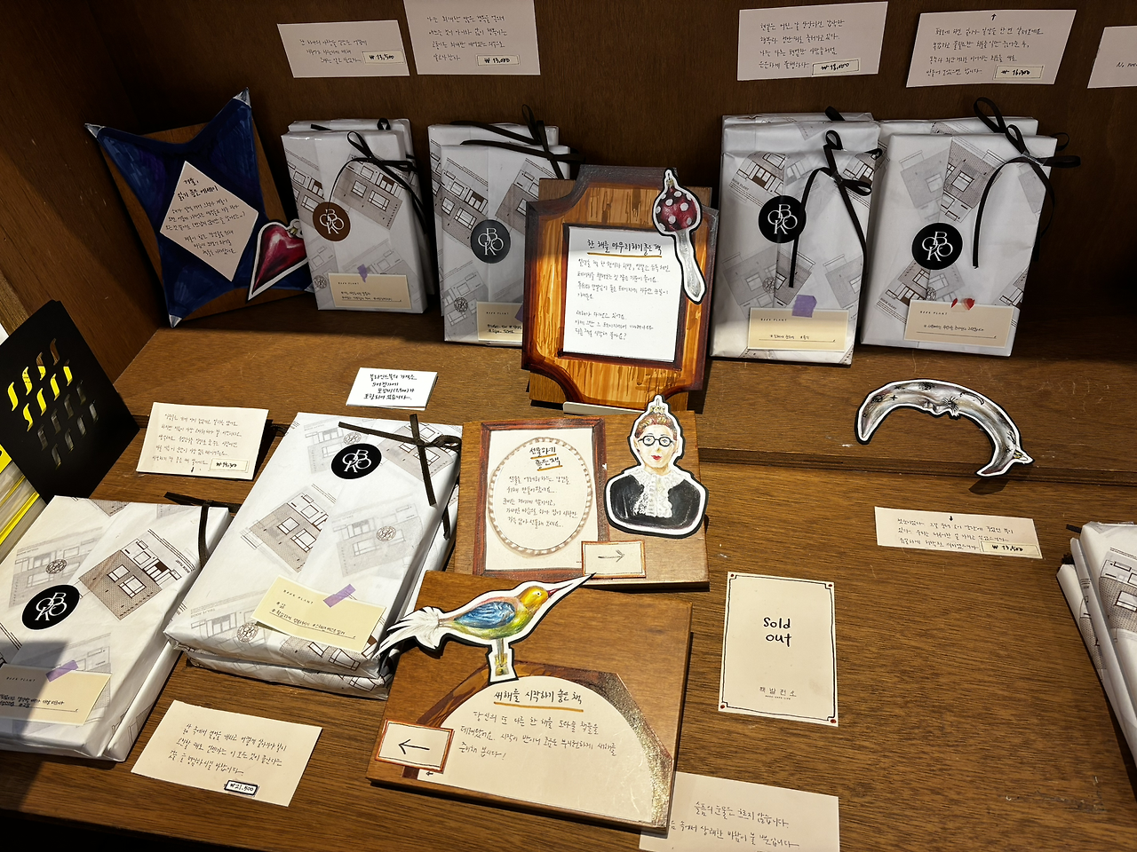 책은 포장되어 있고, 책 속 이야기가 POP로 적혀 있다