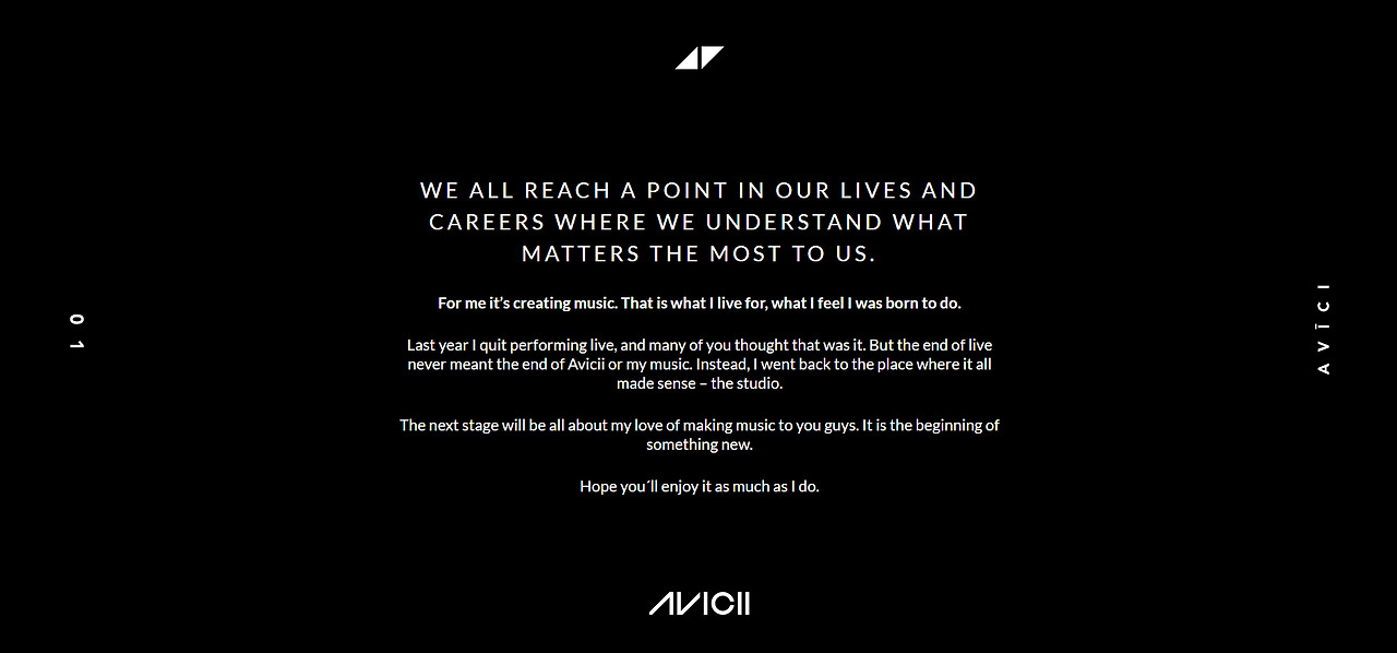음악팬들은 2014년 신해철 이후부터 스캇 웨일랜드 , 데이빗 보위 , 모리스 화이트 , 조지 마이클 , 프린스 , 박건(노이즈가든) , 기명신(러브락컴퍼니) , 레너드 코헨 , 크리스 코넬 , 체스터 베닝턴 , 돌로레즈 오리어던 , 종현(샤이니)까지 물 밀듯 불어닥치는 뮤지션의 사망소식으로 가슴에 큰 상실을 담아야 했다 . 태어나 음악사에 한 획을 긋고 , 유산까지 남기고 떠난 모두를 추모한다 . 나이가 들어도 끝까지 병마와 싸우며 새로운 음악을 들려주려 했던 뮤지션들을 추모하고 , 자신의 손으로 삶을 멈춰야만했던 순간에 어떤 도움도 주지 못했음이 미안해 추모한다 . 그리고 지난 4월 20일 , 또 한 명의 소중한 뮤지션이 우리 곁을 떠났다 . 스웨덴을 대표하는 세계적 음악가이며 프로듀서이자 DJ , 아비치 . 그를 추모한다 .