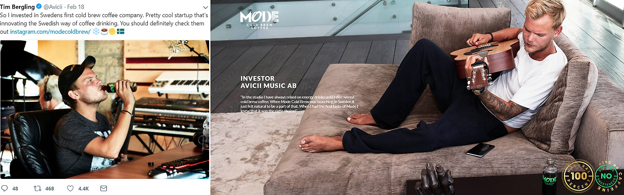 아비치의 SNS를 둘러봤다 . 2월 중순께로 넘어가니 흥미로운 내용이 눈에 띄었다 . 자국 스웨덴에 등장한 첫번째 콜드브루 커피 생산 업체에 정식 투자를 시작했다는 내용이었다 . 회사이름은 Mode Cold Brew Coffee . 홈페이지를 보니 아비치의 투자 사실을 공지하고 그의 코멘트와 사진을 진짜 대문짝만하게 올려놨다 . 추측하건데 그와 작업했던 뮤지션 , 친구들도 공동 투자자로 이름을 올렸고 페루에도 함께 갔던 걸로 추청되는 만큼 상업적으로 접근한 투자는 아닌 것 같아보인다 . 어쨋든 2-3일 간격으로 업데이트 되는 그들의 공식계정 어디에서도 아비치를 추모한다는 문장이 한 줄도 없음을 확인했다 . 회사의 일을 수행하는 홈페이지고 계정이니까 그럴 수 있다 생각은 들지만 , 홍보는 다 써먹어 놓고 ... 흥칫뿡 , 야속하고 치사해 . 혹은 너무 친한 사이라 충격속에 경황이 없을지도.. ( 몇 일 지나 이 글을 업데이트 하는 지금 이 순간까지 다시 확인 해 봤다 . )
