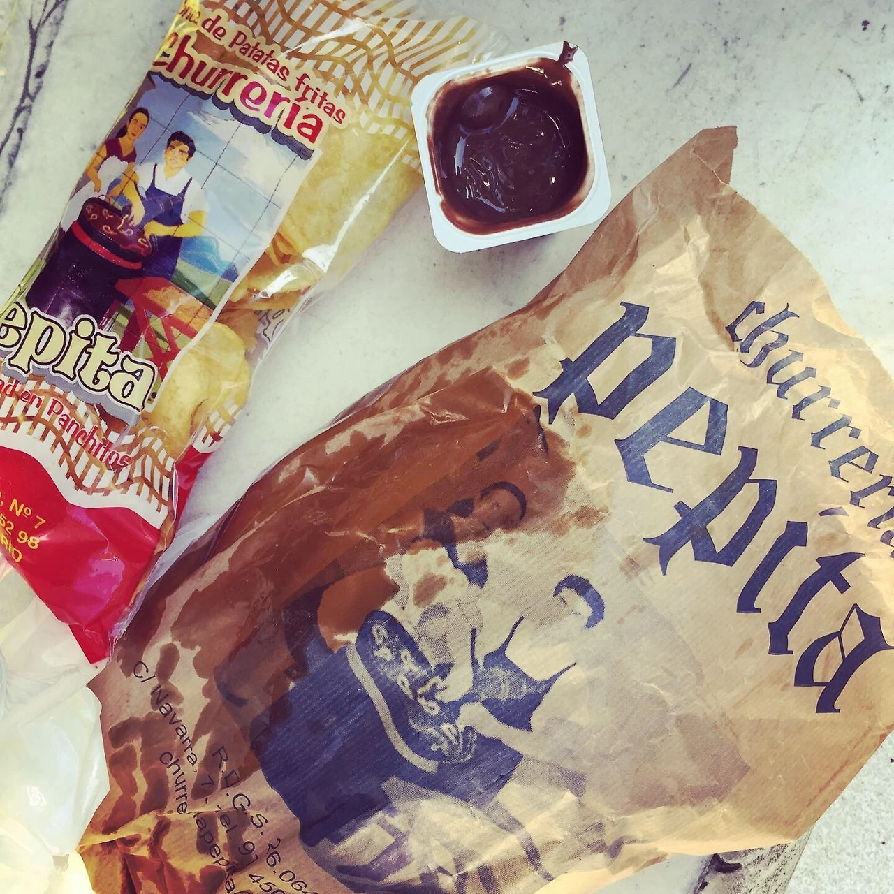 역시 씨벨레스 광장(Cibeles - 발음주의. 수강 중인 예씨 선생님의 동영상 강좌에 따르면 스페인어 자음은 강하게 발음되며 ‘ㅅ’은 ‘th’와 유사하게 구사한다고 한다.)을 지나 티센 보르네미사 미술관에 도착했다. 마드리드 3대 미술관 통합 관람권인 파세오 델 아르떼 카드(Paseo del Arte Cards)을 구매할 때 와 본 길이라 찾기도 쉬웠다. 그때 꼭 앉아보고 싶었던 미술관 정원의 대리암 벤치에 몸을 맡긴다. 그래도 조금 차가운 아침 기온 탓에 엉덩이가 매우 시렵 ㅠ. 그 찰나! 따수운 햇살이 광명처럼 내려 하이얗게 빛나는 옆 벤치의 한 구석이 비었다. 한쪽 끝엔 에스빠냐의 중년 여성이 담배를 쭉쭉 피우고 있었으나 나는 아랑곳하지 않고 뽀라와 초콜라떼(feat. Soja)를 신중하게 개봉했다. 킁킁. 구매 후 30분이 지났지만 고소한 풍미 여전하고요, 유분도 포장지에 쫙 베어 나와 어쩌면 더 개운할지도 모른다는 느낌까지 들었다. 일단 뽀라 먼저, 한입 꼭 베어 문다. 쫜닥바삭파삭고소짭짤한 맛이 응축되어 퍼진다. 뒤이어 기름의 고소한 맛도 따른다. 이번엔 초콜라떼에 찍어서 한입. 크와왕~ (=ㅂ=)// 19세기 유럽 귀족, 왕가의 저택에 마련된 대리암 벤치에 앉아 뽀라와 초콜라떼를 먹고 있자니 5성 호텔 디저트가 부럽지 않은 순간이다.