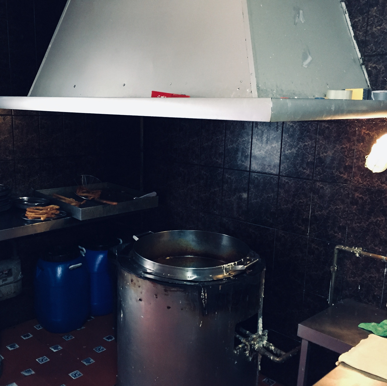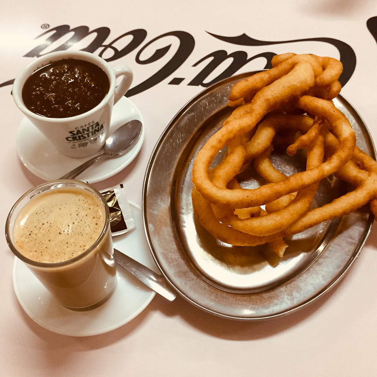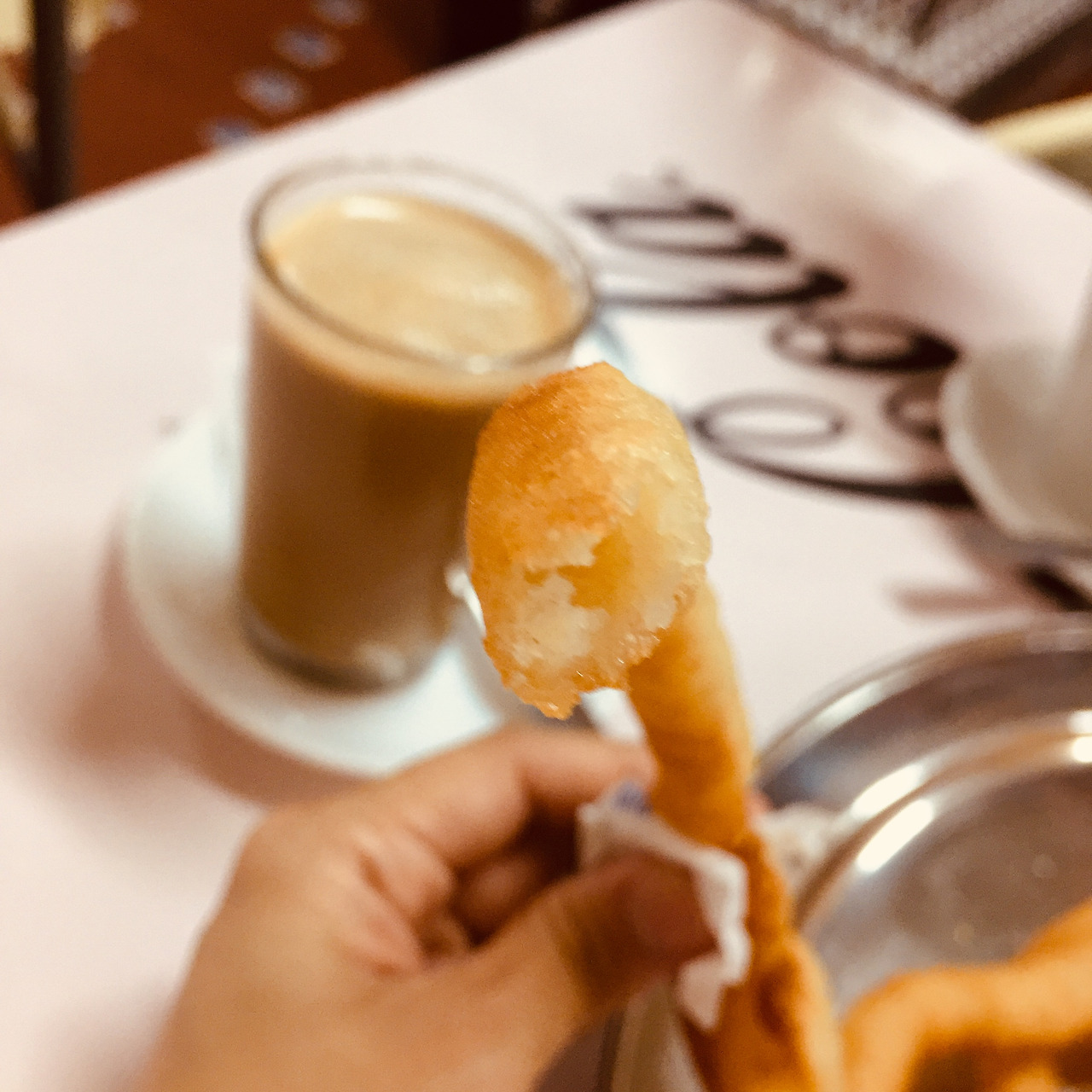 그래도 너무 배가 고파 커피라도 마실 겸 카페 안으로 들어섰다. 우와- 안쪽이 드넓은 매장이었고 눈앞에 떡하니 기름 솥과 추로 반죽이 찰랑이는 기계도 보이고, 저 쪽에 계신 할머니가 추로를 촵촵 드시고 계셨다. 점원께 “추로스 오케이?”라고 말도 안 되는 말을 해보았는데 콩떡같이 알아들으시고 된다고 스페인어로 꿋꿋하게 말씀해주셨다. 나도 찰떡같이 알아들었다. 몹시 배가 고팠던 나는 “우노 초콜라떼 꼰 추로스, 우노 까페 꼰레체 꼰 추로스. 뽀르빠보르”라고 말씀드렸다. 그렇다 평소보다 추로를 두 배로 시켰던 것이다. 주문과 함께 한쪽에 대기하던 직원이 반죽을 슝슝 뽑아 기름 솥에 던져 넣었다.