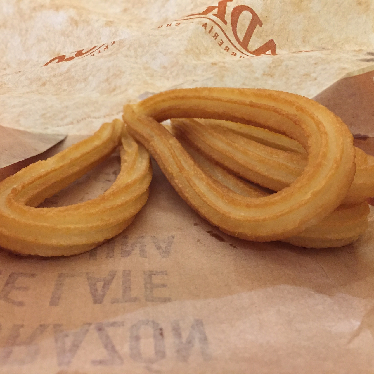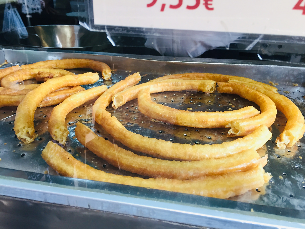 곧바로 에스프레소만 들어있는 잔과 빈 잔이 하나 나왔다. 그렇다. 로스 바예는 초콜라떼도 주전자를 가져와 빈 잔에 따라주는 시스템. 이것도 신선하네! 입구 쪽에 계신 주인아주머니가 힘차게 돌려 갓 튀겨낸 추로를 마지막으로 말라가와도 이별이다. 근데 이 모습을 보니 진짜 우리 동네 떡볶이 가게가 떠오른다. 추로를 한 입 깨물자 바사삭하면서도 조직감이 성글게 느껴졌다. 가장 묽은 반죽이었고 때문에 기름 온도도 높았던 것 같다. 못난이 튀김, 오징어 튀김 같은 게 마구 떠오르는 맛과 생김새, 분위기였다. 아, 염분도 이곳이 가장 높았다. 초콜라떼도 달게 느껴지기도 했고. 극강의 단짠 조합을 자랑하는 추레리아였다.