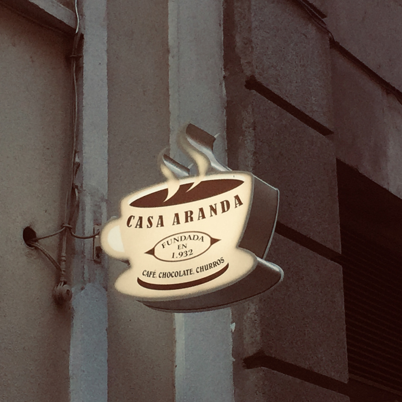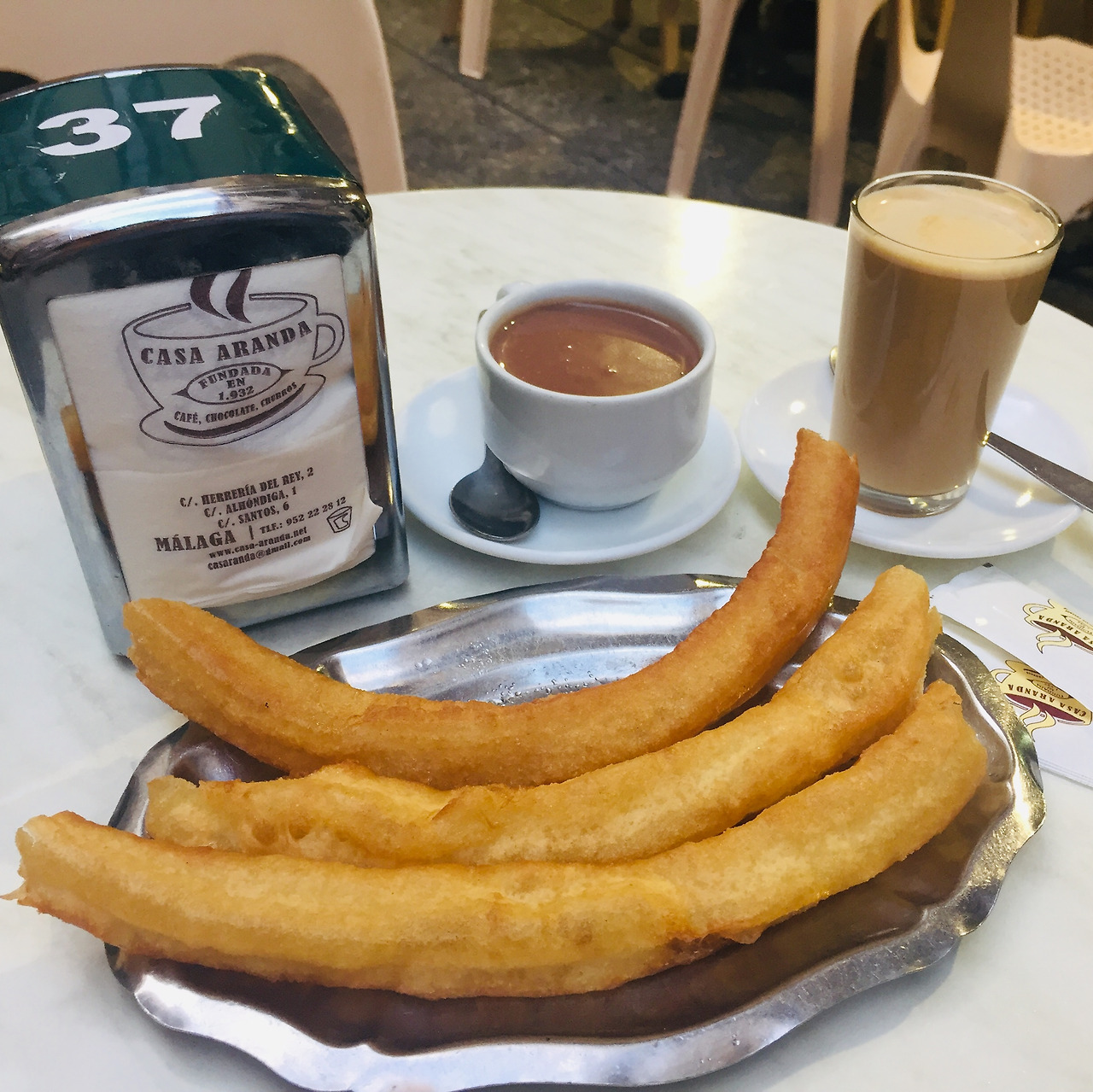 100년 전통의 까사 아란다. 현지인의 해장과 이른 아침부터 배고플 여행자들에게 빛과 소금이 되어주는 말라가의 대표 추레리아다. 센트로 본점은 센트로의 센트로, 중앙의 정중앙에 있다. 골목 전체가 까사 아란다로 상권이 통일되었을 만큼 규모가 큰 곳이지만, 건물을 다 부수고 지어 통합한 게 아니라 시간이 지나며 한 점포 한 점포 늘여갔기 때문에 운치가 있다. 각 분점 가게들도 쫙 붙어있지 않고 하나 건너 하나, 마주 보고 하나 있는 형태라 테라스에 앉아 먹으면서 그 모습이 흥미롭다고 생각했다. 음료의 가격은 바, 홀, 테라스에서 마시는 게 각각 다르다. 관광객들이 장시간 고민하거나 말하기 힘들어하면 웨이터들이 “원 추로 원 초콜라떼?”하며 물어본다. 나는 자리에 엉덩이를 붙임과 동시에 웨이터와 눈이 마주치면 “우노 초콜라떼 꼰 뽀라스(or 추로스), 우노 까페 꼰 레체(or 꼬르따도) 뽀르빠보르. ”라고 정해진 말을 외친다. 웨이터라고 하기엔 다정한 중년의 모습이 꼭 아빠처럼 느껴지던 점원께선 내 얼굴을 한 번 보고는 ‘무이비엔, 무이비엔, 발레!’ 라며 박수를 쳐주었다. 그도 그럴 것이 1일 1추로를 목표로 한 달 넘게 매일같이 정해진 주문을 되뇌었던 미쇼 씨가 아니던가! 군더더기 없이 신속 정확한 주문에 칭찬해 주신 점원 덕분에 말라가에서의 추로 탐험은 기분 좋게 시작되었다.