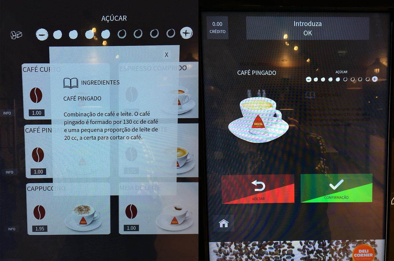 어쩐지 야근, 철야를 하는 기분도 든다. 아직 버스 출발까지 23분이나 남았고 기사님은 샌드위치와 오렌지주스를 먹고 있었다. 일부러 옆에서 알짱대본다. 나 놓고 떠나지 말아 달라는 작전이다. 포르투갈 사람인 그는 살바도르 달리처럼 콧수염 양 끝을 둥글려 익살스럽게 손질했다. 190cm이 넘는 큰 키에 듬직한 체격, 중년의 품격인 뱃살과 제복, 몇 가지 안전용품이 부착된 벨트까지 두루 갖춘 모습이었다. 거기에 뮤지컬 배우 같은 동굴 발성은 역시 뱃심이겠지? 그를 관찰하다 눈이 마주쳐 서로 찡긋- 인사를 나눴다. 야간버스의 캡틴, 기사 아저씨의 듬직함에 점점 기분이 나아졌다. 이제 마음 놓고 휴게소 안을 둘러본다. 무인 커피 자판기가 있었다. 금액은 알겠는데 작동법은 잘 모르겠고, 일단 동전을 넣자 주문 가능한 음료에만 불이 들어온다. 역시 자본의 원리는 같구나. 리스본 도착까지 화장실에 갈 수 없을 테니 양이 적고 가장 저렴한 1유로 커피 중 PINGADO를 골랐다. 알 순 없지만 설명을 보면 느낌적 느낌이 꼬르따도(Cortado, 에스프레소 라떼 같은 작은 양의 밀크커피) 같았다. 근데 왜 설탕이 들어있는 거죠?!! (나중에 사진을 보니 터치 비전 위에 설탕 조절 버튼이 있었다는 사실.)