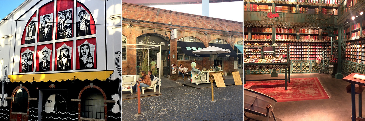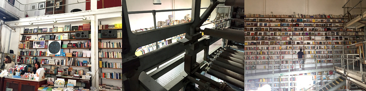 19세기 떼주 강변 알칸타라(Alcantara) 일대에 대형 공장들이 들어섰지만 점차 잊혀지고, 방치되어 폐허가 되고 말았다. 하지만 대략 10년 전부터 리스본의 디자이너들과 아티스트, 크리에이터들이 이곳으로 모이기 시작했다. 오래된 공장 건물의 외관과 골조는 살리되 자신들의 아이덴티티를 보여줄 수 있는 공방과 작업실을 만들고, 샵을 런칭하며 리스본의 또 다른 매력을 선보이는 핫스팟이 된 거다. 우리네 성수동, 힙지로, 문래동 정도가 비슷한 대상이긴 한데 LX팩토리는 타운 형태로 밀집되어있다. 갤러리, 편집샵, 초콜릿 가게인 줄 알았던 정어리 통조림샵(정어리는 리스본의 상징이기도 하다), 크고 작은 레스토랑, 유명한 햄버거집, 수제 맥주집, 기념품점, 코워킹 스페이스, 호스텔, 그리고 가장 보고 싶었던 서점 ‘레르 데바가르 (Ler Devagar)’가 있었다. “책의 뇌에 들어온 듯 기막힌 서점”이었다. 입구부터 2층, 3층 어마 무시한 서적의 양과 중고 음반들, 오래된 대형 인쇄기 사이로 꾸며진 공간들이 책 속으로 빨려 들어가듯 구성되어있었다. 인생 사진 찍기에도 그만인 곳이었다.