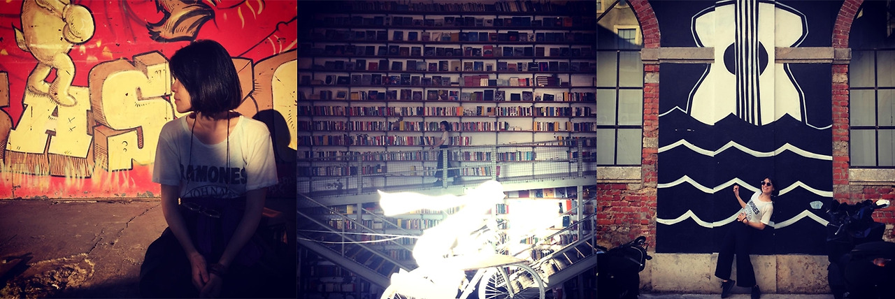 혼자 서점 내부 사진을 찍고 있는데, 역시 혼자 여행 온 서양인이 자신의 사진을 하나 찍어달라고 부탁한다. 그리고 그녀도 내 사진을 찍어주겠다고 한다. 오케이. 우리는 멋쩍지만 서로를 응원하는 마음을 담아 인생 샷을 찍어주려 애썼다. 결과물은 서로 대만족. 그래서 서점 밖에서도 몇 장 더 찍었다.