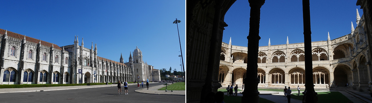 이번엔 피게이라 광장으로 간다. 어제 시간을 보냈던 호시우 역 근처다. 이곳에서 트램 15번을 타고 벨렝(Belem) 지역으로 간다. 세계유산으로 유명한 제로니무스 수도원 (Mosteiro dos Jerónimos)에 가장 먼저 들른다. 땡볕 아래 입장 대기줄이 무척이나 길지만, 리스보아 카드 소지자라면 무조건 줄 설게 아니라 앞쪽으로 가서 확인하면 별도로 입장하는 줄이 있다. 이미 리스보아 카드를 구매할 때 수도원 입장권을 구매한 것이나 다름없기 때문. 고로 나는 즉시 입장할 수 있었다. 바깥의 대기줄에 비하면 내부의 인구밀도는 적었다. 수도원에 걸맞게 고요했다. <해리포터>의 작가 조앤 롤링이 포르투갈에서 영어교사로 일하면서 영감을 얻은 곳이 몇 군데 있는데 이 수도원 역시 눈여겨보았다는 카더라를 접한 적이 있다. 수도원 내부의 회랑, 계단들은 작품 속 기숙사의 모습들과 참 많이 닮았다. 회랑 안쪽 잔디밭은 삼총사가 뛰어다니던 교정과도 비슷했다. 빗자루 하나 있으면 살포시 타보고 싶었을 만큼. ^^*