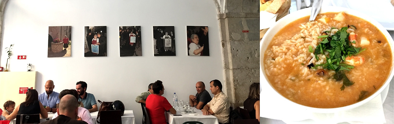 정한 곳이 없기에 구글맵을 켜고 인근에 별점이 높은 곳을 찾아가기로 했다. 그중 한 곳이 꽤 마음에 들었다. 일단 간판이 없었다. 문에 영업시간과 오늘의 메뉴만 붙어 있고, 아시아 사람 한 명 없이 현지인들로 북적이는 듯했다. 용기 내서 문을 열고 들어가니 안경을 쓴 주인아저씨가 인사를 건넨다. 1명이라고 손가락을 들어 표시하고 서있자 벽 쪽 작은 테이블로 안내를 해주며 메뉴판을 놓고 가신다. 내가 미쳤는지 용감하게 샹그리아를 시켰다. 왜냐하면 ‘씨푸드 라이스 수프’ 즉 해물밥을 발견했기 때문이다. 리스본에서 해물밥을 먹으라고 추천도 받았는데, 유명한 집들을 검색해본 결과 1인분 불가, 엄청 대기, 불친절, 가격 대비 비쌈 옵션을 줄줄 달고 있어서 포기한 찰나였다. 그런데 이곳은 포르투갈 가정식을 판매하는 곳이었고 벽에 장식된 사진을 보니 2대 사장님의 남편이 나를 맞이해준 분으로 추정되었다. 그리고 내 앞에 놓인 대박적 음식 해물밥. 맵지 않은 짬뽕밥이랄까? 엄마 생각이 날만큼 속이 시원~했다. 포르투갈 특유의 그린 화이트 와인으로 만든 샹그리아는 말해 뭐해, 냠냠. 가성비 끝판왕이 여기 있구나!!