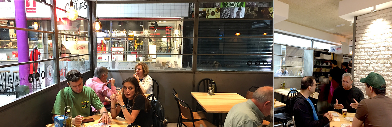 마드리드에서만 전통시장을 10곳 이상 둘러봤다. 대부분 정겨운 분위기지만 관광객을 유치하기 위해 새롭고 편리하게 재정비한 곳도 있고(=비쌈), 박람회장 푸드 코트처럼 실속 없는 곳도 있었다(=화가남). 서민적인 동네에서 들쭉날쭉 영업하거나 암울한 분위기를 풍기는 곳도 있었다(=당황스러움). 하지만 이곳 빠스 시장은 내가 딱 이상적으로 생각하는 동네의 활기참과 저렴한 먹거리 겸비했다. 규모도 너무 크지 않아 상인들끼리 겹치는 품목도 적었다. 실내 광장 공용 식탁에 둘러앉은 사람들이 어떤 메뉴를 주로 먹고 있나 살펴보니 공통된 게 하나 있었다. 노오란 조각 케이크의 형상을 한, 내 사랑 또르띠야(Tortilla)였다. 보기만 해도 부드러움이 넘쳐흐르네. 대체 어딨니? 꼬수운 냄새를 따라 킁킁거리며 걸어보니 오오!!! 한쪽 벽에 자리한 오픈 주방이 보였다. 여기로구나, 풍악을 울려라~
