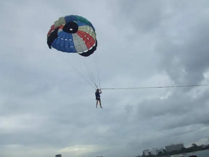 몸에 풍선을 매달고 하늘에 둥둥 떠있는 패러세일링이라는 레저가 있다. 처음 낙하산 같은 풍선을 메고 바다로 뛰어들때는 조금 무섭지만(태국 오빠가 "누나 달려요."라고 한다) 곧 배에 묶여있어서 풍선을 타고 몸이 하늘 위로 둥실 떠오른다. 나중에 보라카이에서도 했었는 데 태국에서 했던 것은 좌석이 없고 빈몸으로 떠 있어서 더 기분이 좋았다.