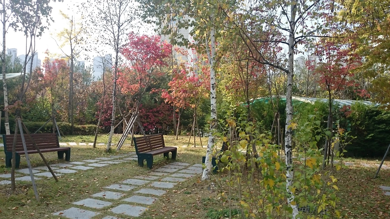 푸른 소나무와 파란 하늘과 가지가색의 가을잎들 사이로 걸어봅니다.