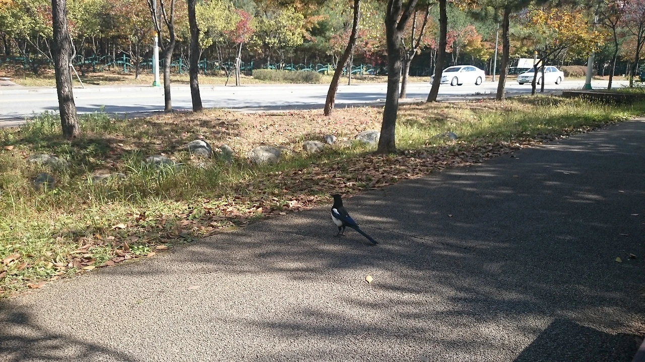주변에 짹짹거리는 새소리가 들리고 까치 한마리가 콩콩거리며 제 주변을 걸어다닙니다.