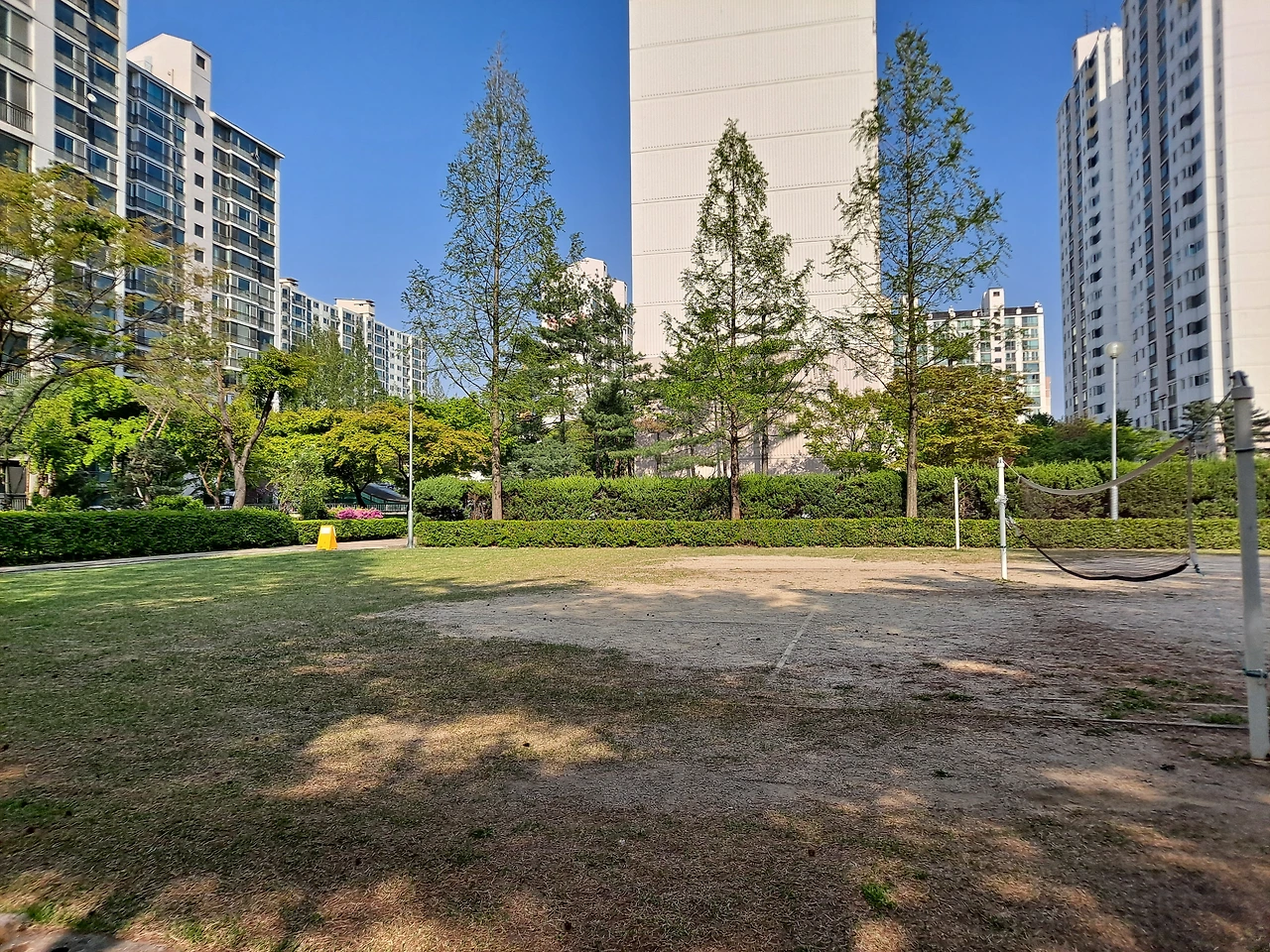 하늘 빛은 마냥 푸르고 오늘도 구름 한점 없다. 가깝고 먼 나무에서 여러 종류의 작은 새 소리만 나지막히 들려올 뿐이다. 네모난 잔디밭 공간 안에 오후의 시간이 잘려져 가두어져 있는 것 같다. 노랑과 진분홍빛 밝은 칼라의 옷을 입은 아이 둘이 발랄하게 엄마와 함께 지나간다. 운동을 하려는 듯 뛰어나가는 청년 그 다음에도 주로 노인들이 몇몇 다들 바쁘게 각자의 길을 가고 있다.푸른 잔디와 배드민턴장이 그려진 미동도 없이 움직이지 않는 그림 안에 살아 있는 사람들이 들어왔다가 나갔다가 하는 것 같다.