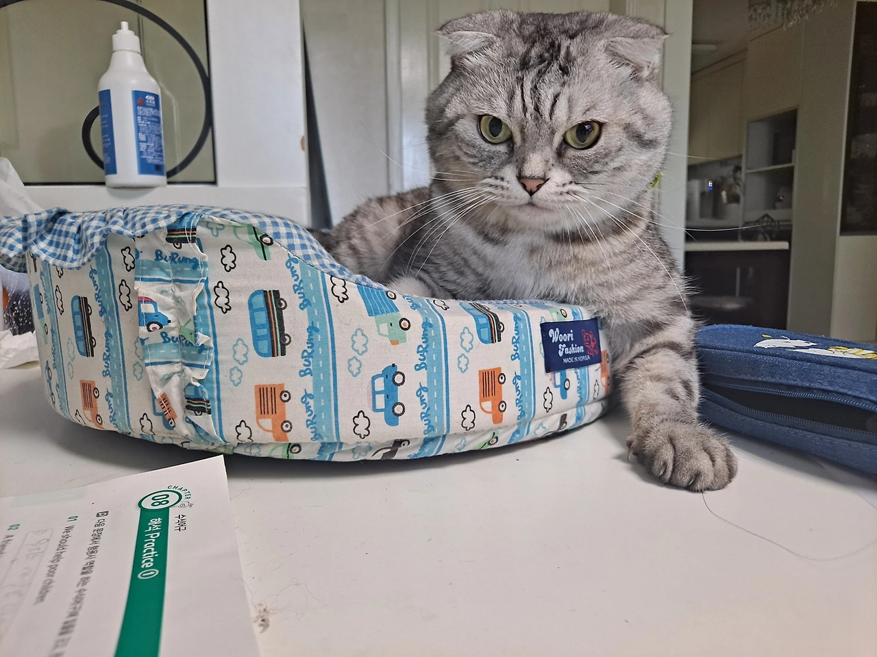언제나처럼 아이는 고양이를 방석에 넣어서 데려왔다.