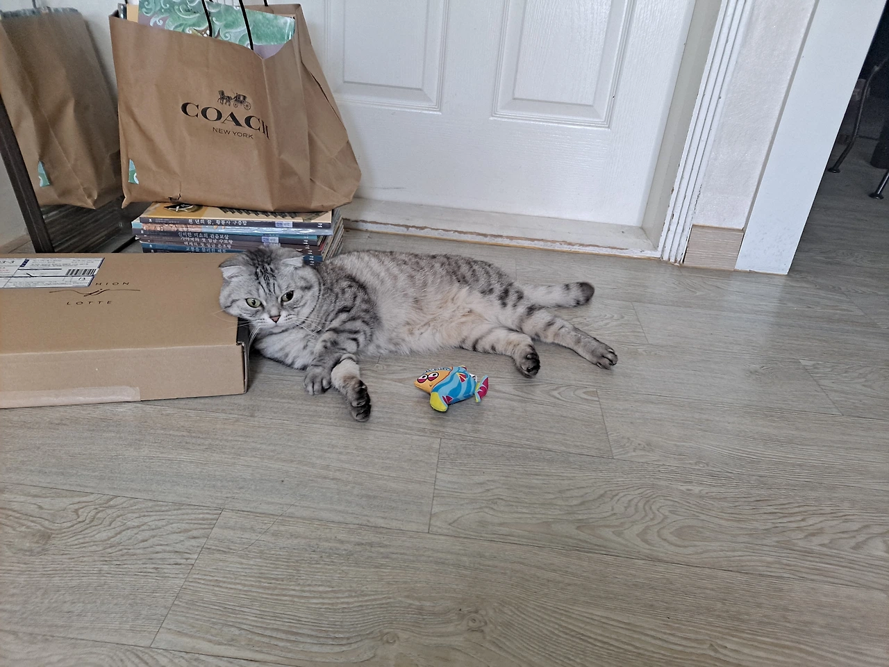 스트레스를 완화해주는 캣닢이 들어있다는 물고기 모양 인형을 던져 주었다. 잠깐 탐색을 하더니 손으로 툭 쳐서 날리고 점프를 하고 또 미친 듯이 따라간다.