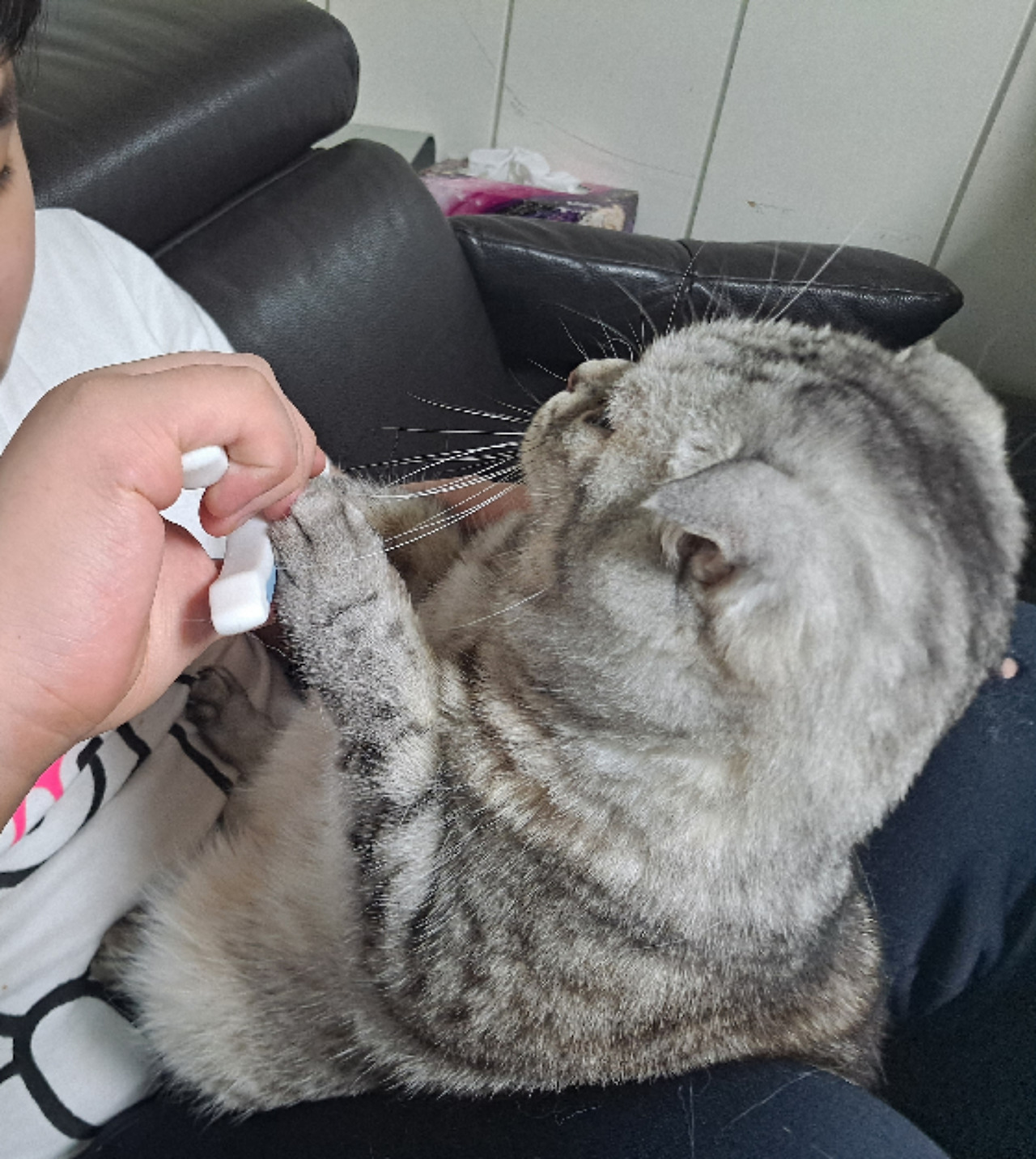 아이는 좀 서툴렀다. 고양이는 틈나는 대로 탈출을 시도하고 아이는 나에게 얼른 츄르를 대령하라 하였다. 부랴부랴 가위를 찾아서 츄르를 입 앞에 갖다 드렸더니 고양이는먹느라 조금 안정이 되는 듯 잠깐 잠잠하였다. 하지만 한 개로는 부족하였다. 두개째의 츄르를 급하게 뜯어서 입 앞에 바쳐드렸다. 두개 까지는 그럭저럭 드셨으나 더 이상 먹는 거고 뭐고 이 꼼짝 못하고 잡혀 있는 상황이 짜증이 나시는 것 같았다. 발톱을 자르고 살짝 갈아주었는데 발톱이 좌,우로 마구 움직이는 것 같아 왕창 빠지는 게 아닌가 무서워졌다. '무언가 잘못하는 게 아닌가?' 결국 세 개째의 츄르를 우왕좌왕하며 먹이고 나서야 발톱 관리는 끝이 났다.