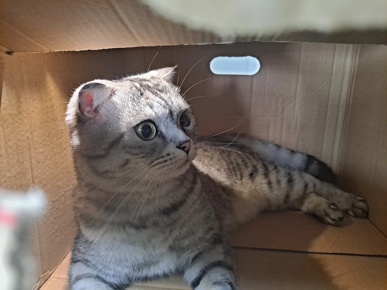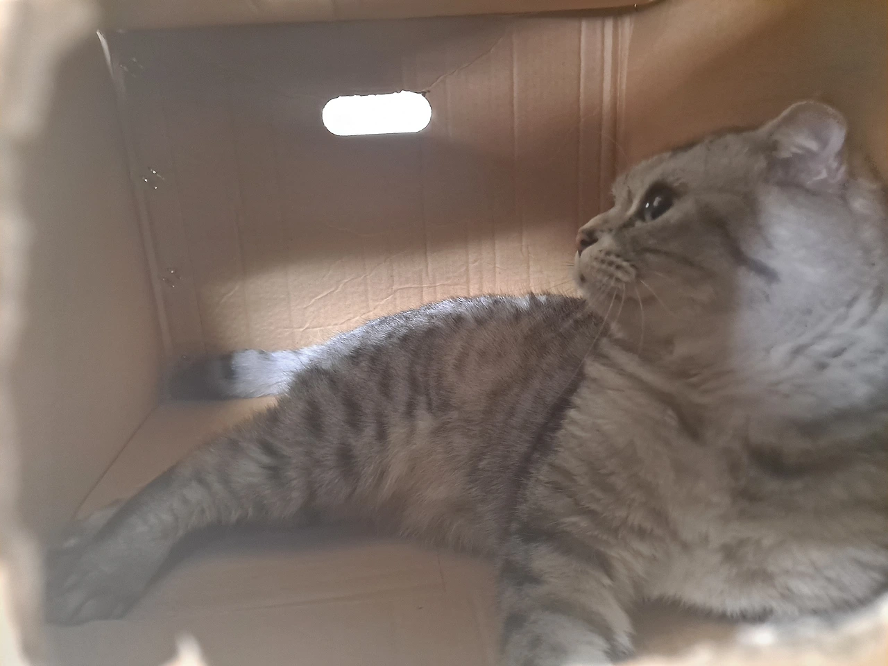 상자 하나를 가져와서 두 인간의 맹목적인 애정 표현에 지쳐서 숨고 싶어하시는 고양이님을 넣어드렸다. 상자의 작은 구멍을 좀 더 확장하여 큰 창을 내드리고 핸드폰 조명을 더하여 사진을 찍으니 고양이님의 미모가 더욱 빛나신다.