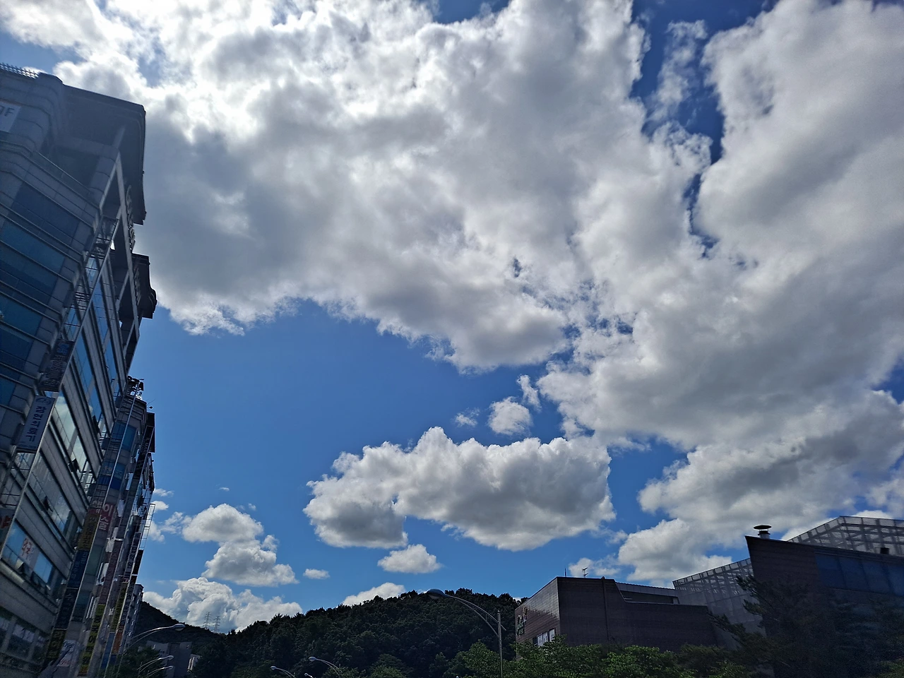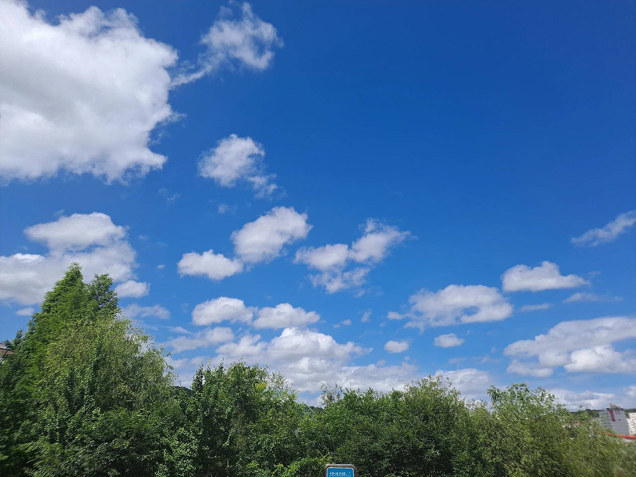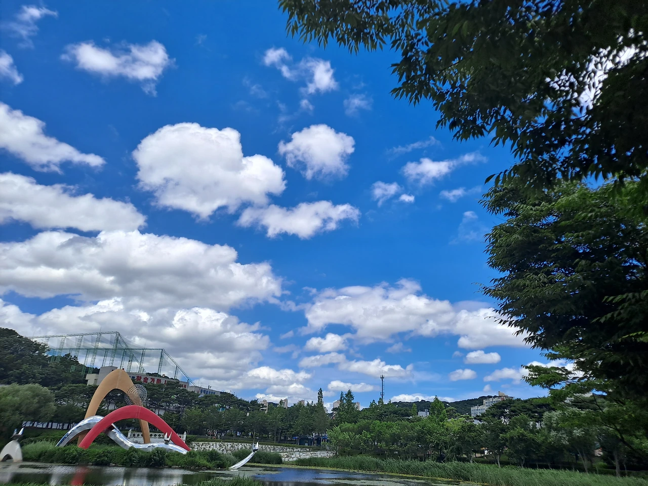 오전 산책을 나섰다. 어제 조금 내린 비로 온 세상이 새로 태어난 듯 해맑게 씻긴 것 같았다. 파란 하늘에 부피감이 큰 흰 구름들이 뭉텅이로 풍성하게 떠 있다. 잔디 위에 돗자리를 펴고 누워서 푸른 하늘에 흰구름만 몇 시간 쳐다보아도 마음에 힐링이 될 것 같은 날. 구름과 바람이 만들어 내는 시시각각 변화하는 오묘한 작품을 아무 시름없이 감상하고 싶다.