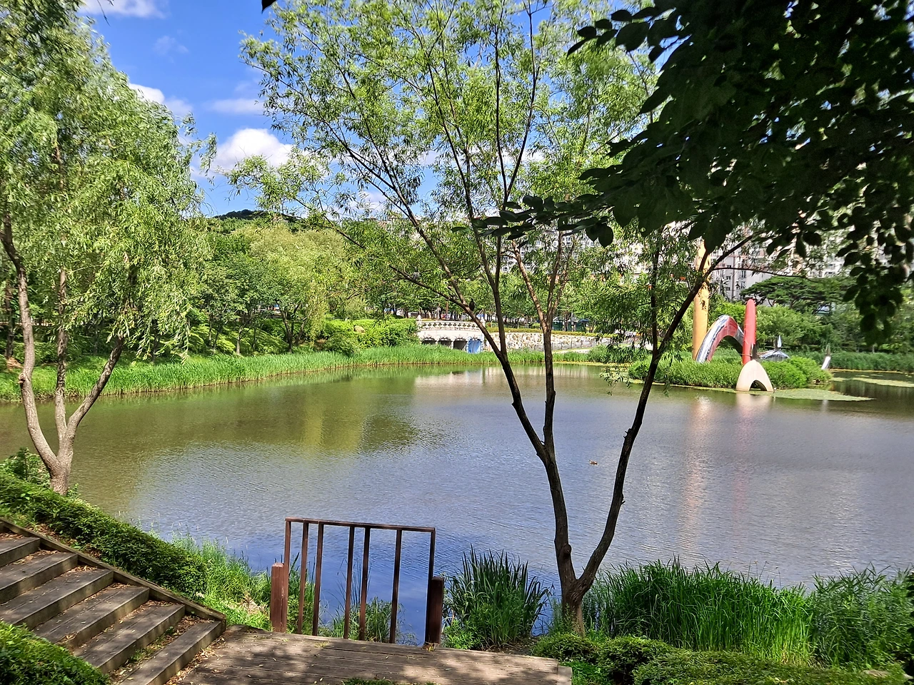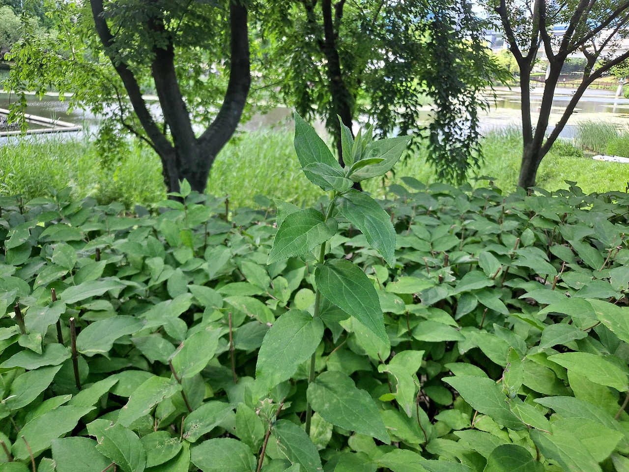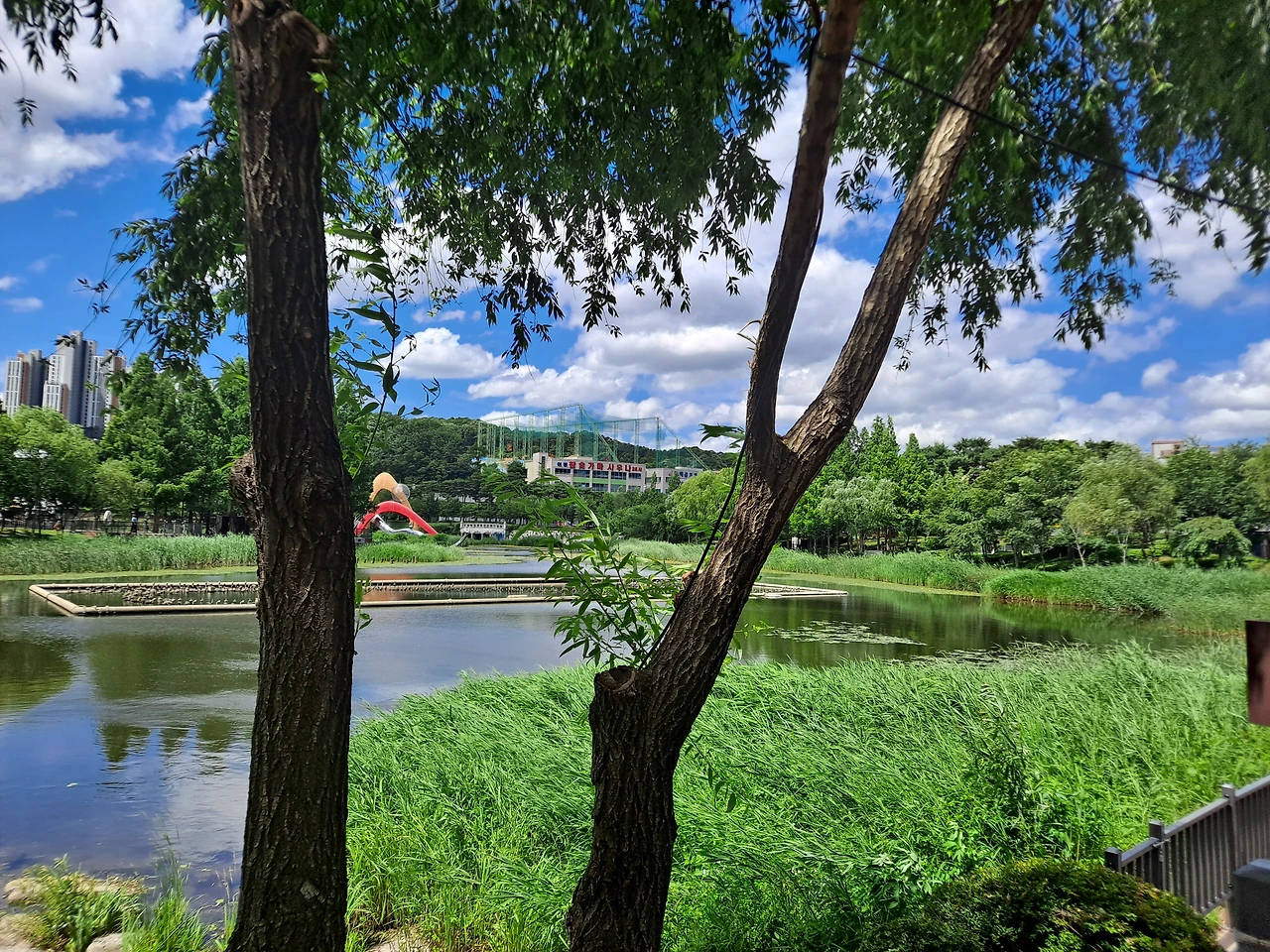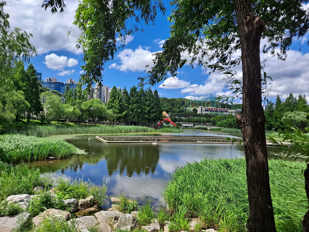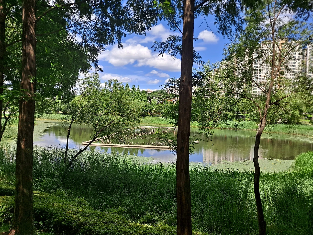 호수 위의 수생 식물 위에는 노랗고 조그만 꽃이 잔뜩 피어 있다. 물 위에 피는 노란 꽃은 이름이 무엇일까? 갑자기 한 여름 칠월이 되면 피어나는 하양이나 연분홍빛 우아한 연꽃의 자태가 떠올랐다. 칠월이 되면 연꽃을 구경하러 가 볼까?