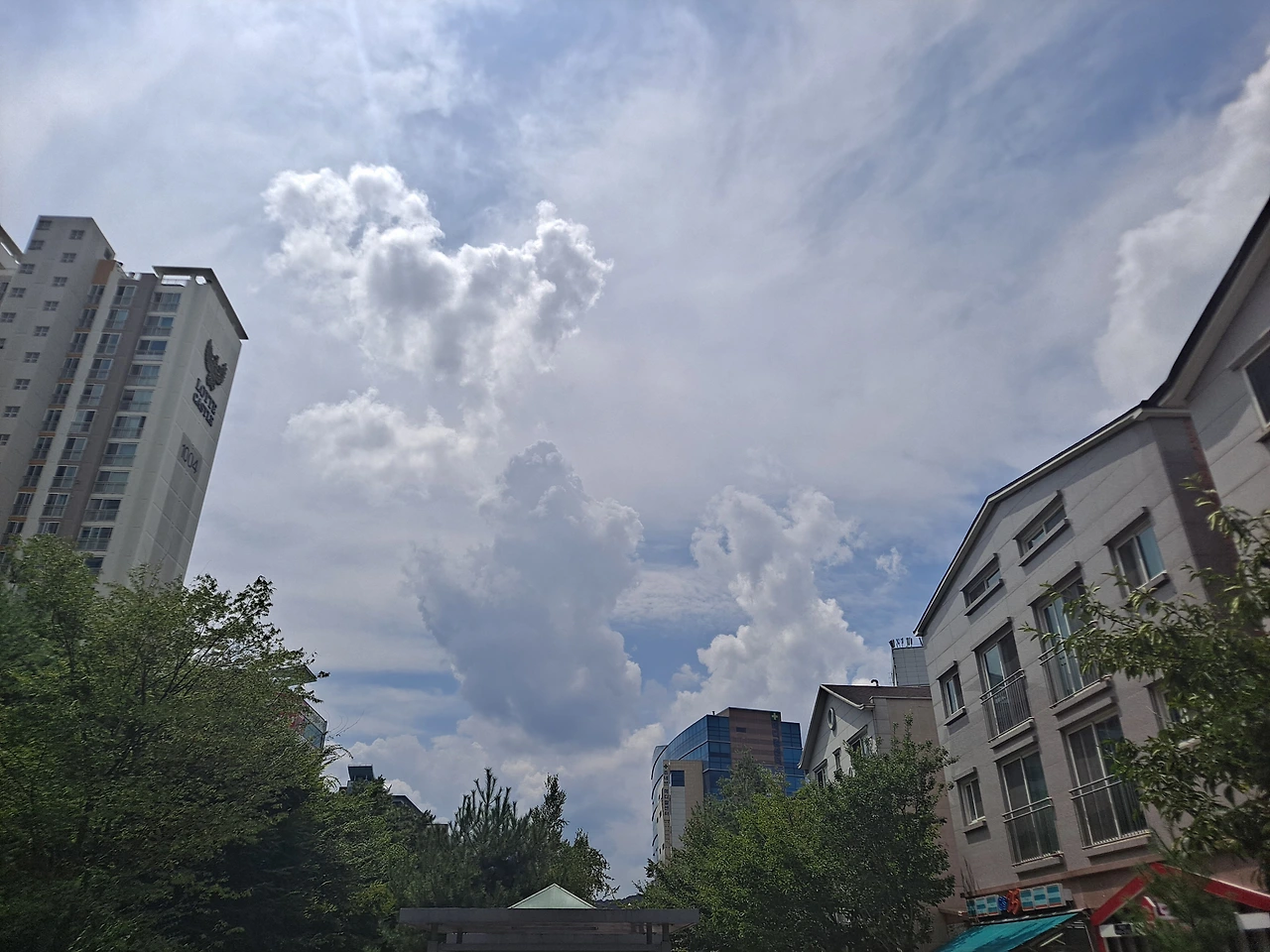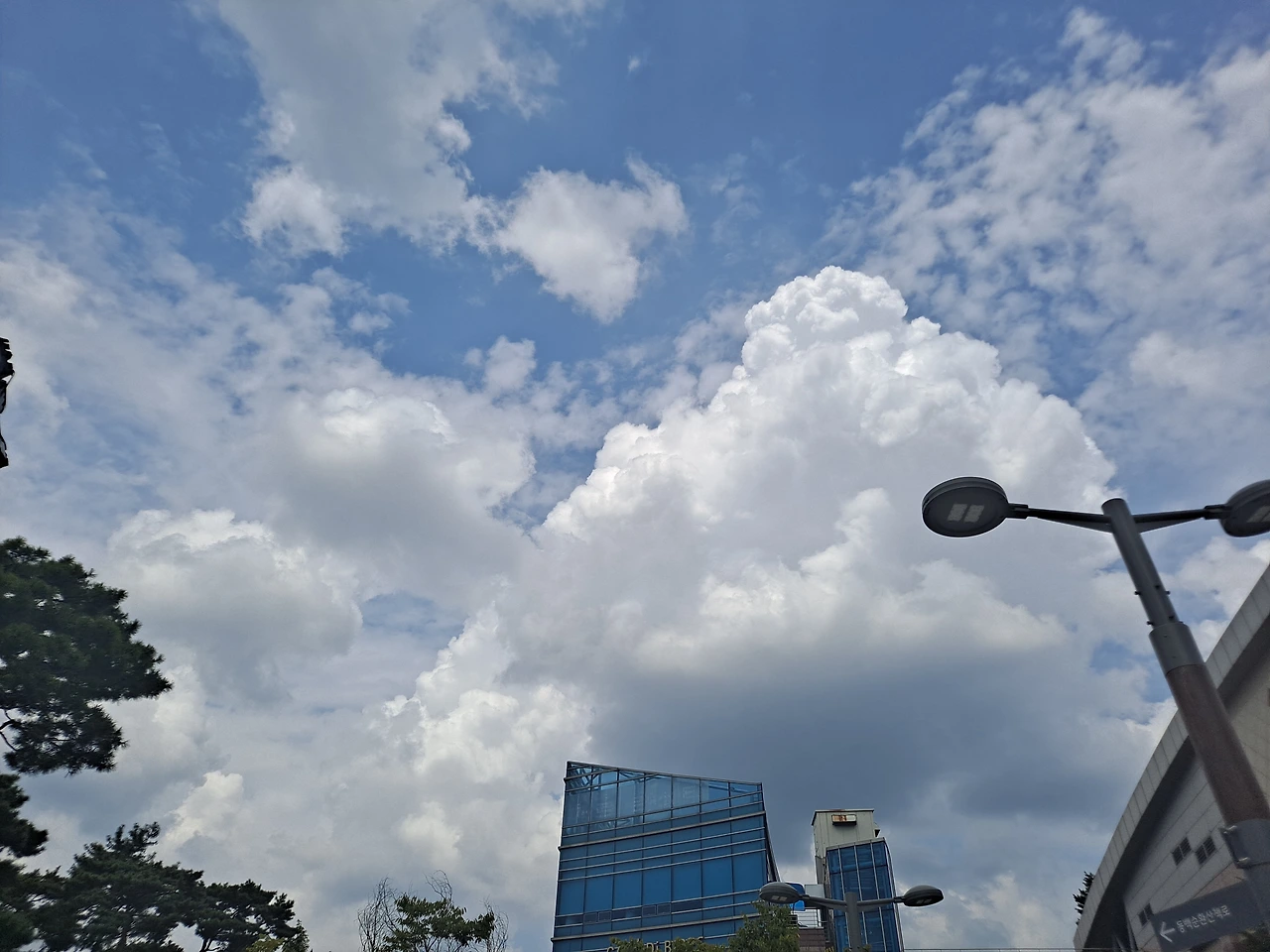 하늘을 보면 검은 구름과 흰구름이 겹쳐서 함께 어깨를 마주하고 떠 있다. 동남아의 스콜처럼 검은 구름에서 가끔씩 부분적으로 비가 세차게 뿌린다. 이 비는 지겨운 여름을 물러가게 하고 청명한 가을을 불러오는 비이니 고맙기만 하다. 이제 인간이 느끼기에 최상의 날씨가 다가온다.