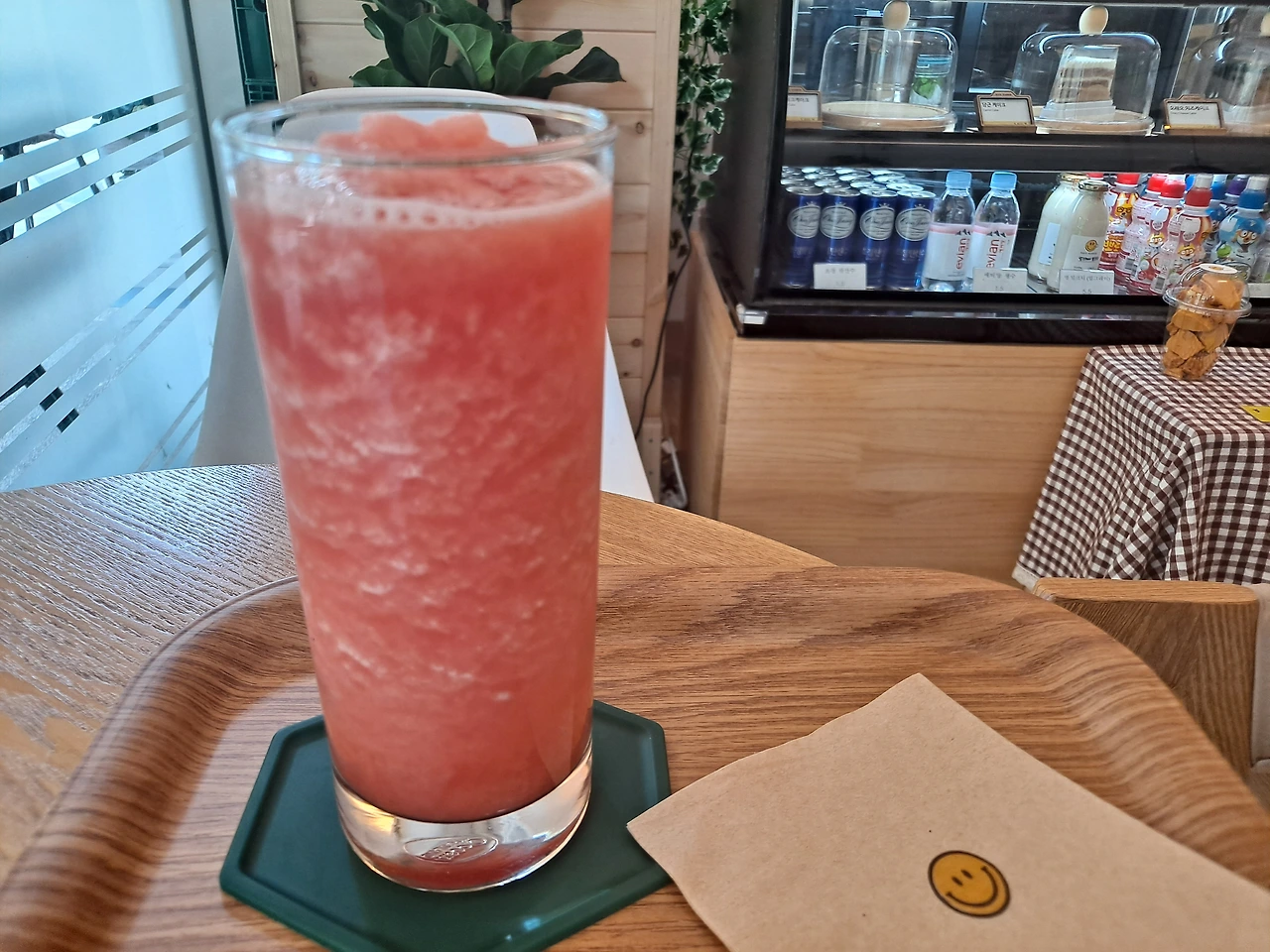 검은 구름과 흰구름이 함께 그토록 여름 내내 애정하는 아이스 아메리카노 대신 수박 주스를 주문해 보았다. 여름도 다 끝나가는 무렵, 고운 빛깔을 뽐내는 반가운 수박 주스 한잔. 올 여름에는 수박을 한번도 사보지 않은 것 같으니 처음이자 마지막 수박이다. 은은한 단맛이 감도는 청량한 수박 주스도 만족스럽다.