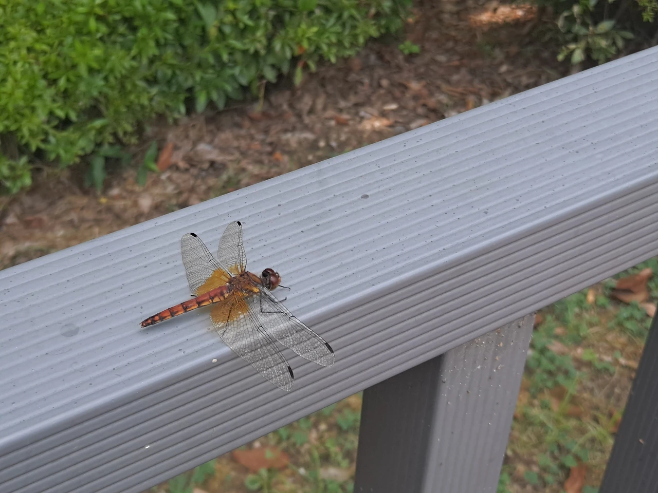 그리하여 대낮에 산책을 나왔다. 호수 주변의 난간에 고추 잠자리가 한마리 가만히 앉아 있었다. 어찌 된 일인지 가까이 다가가도 미동도 없다. 혹시 사진을 찍는 데 날아갈까 숨을 죽이고 다가갔는데 아마도 이 잠자리도 간밤에 잠을 설쳤을 수도 있다. 귀찮은 인간이 다가오던 말던 잠시 쉬고 싶은 휴식 시간이었는지도.