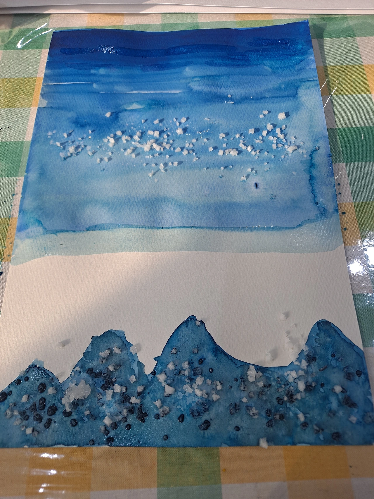 성격대로 거침없이 그려 넣고 소금을 뿌려서 별빛을 표현해 보았는데 물감이 마르기 전에 뿌려야 하는데 타이밍도 잘 못 맞춘 것 같다. 산의 회색이 잘 안나와서 소금 위에 검정색을 덧칠까지 했다. 망할 망. 망하면 어떤가 나의 고유한 예술세계를 마음껏 펼쳐보며 즐거우면 됐지. 그리고 꽃과 이파리 세 개도 하나 그렸는데 시간이 없어서 허둥지둥 다음 시간에 마무리 할 것을 기약하고 뛰쳐 나왔다.