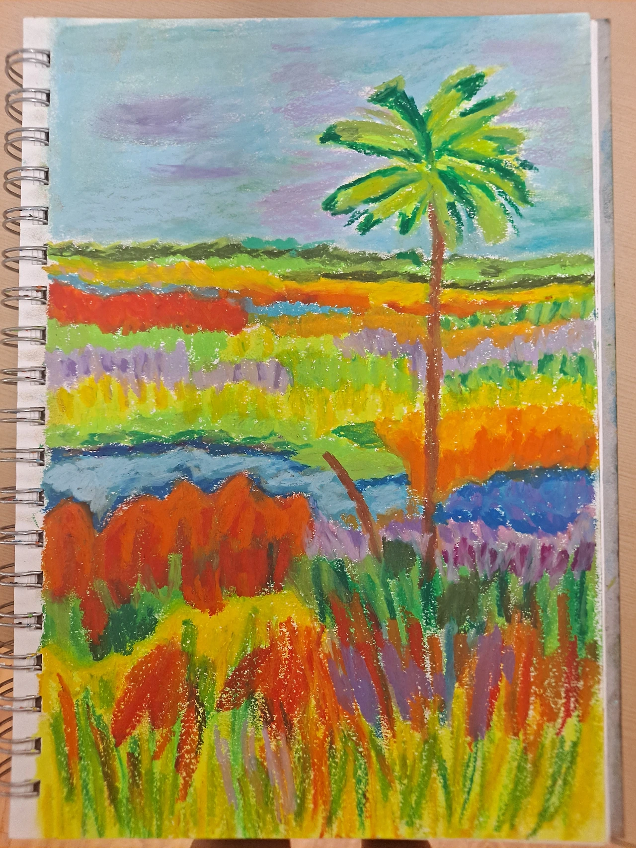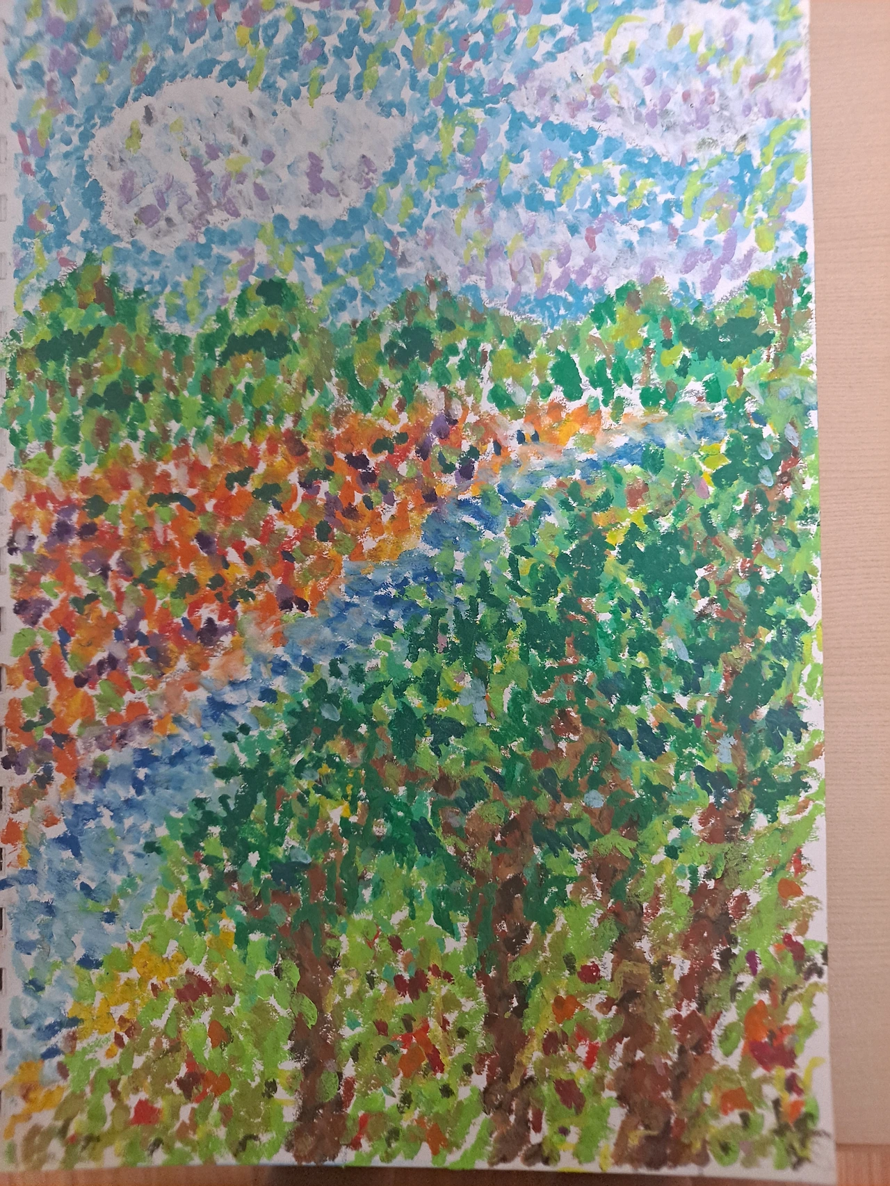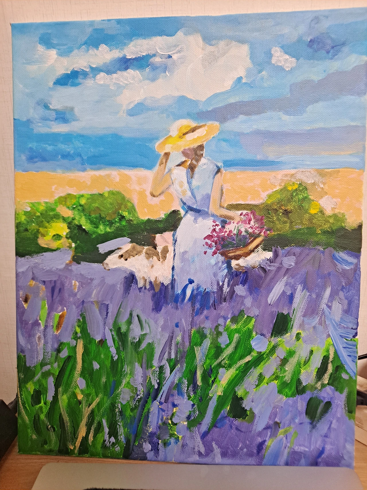 선생님께 들은 조언을 바탕으로 캔버스에 이런 저런 그림을 시도해 보려고 한다. 첫 캔버스 그림도 가져와서 조금 수정해 봤다. 이 그림은 스케치 정도만 했고 선생님이 슥슥 대부분 수정하며 지도해 주신거라 내 그림이라기엔 머쓱하다. 책상 위에 올려 놓으니 뿌듯하고 색감도 마음에 들어 오고 가며 계속 힐끔거리게 된다.