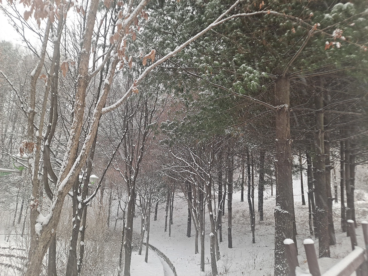 오랜만에 눈의 세상을 구경하러 나갔다. 눈이 온 풍경은 굳이 차를 몰고 나갈 일만 없다면 다른 세상에 온 듯 신비롭고 아름답다. 어느새 온 누리를 하얗게 덮는 눈. 뽀드득 눈 밟는 소리를 내며 걸어본다. 오늘의 눈은 비가 많이 섞여서인지 손에 닿으니 뭉쳐지지 않고 스르르 녹아버렸다.
