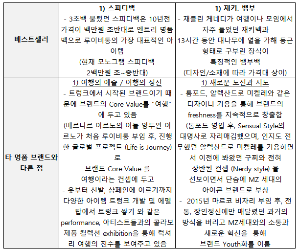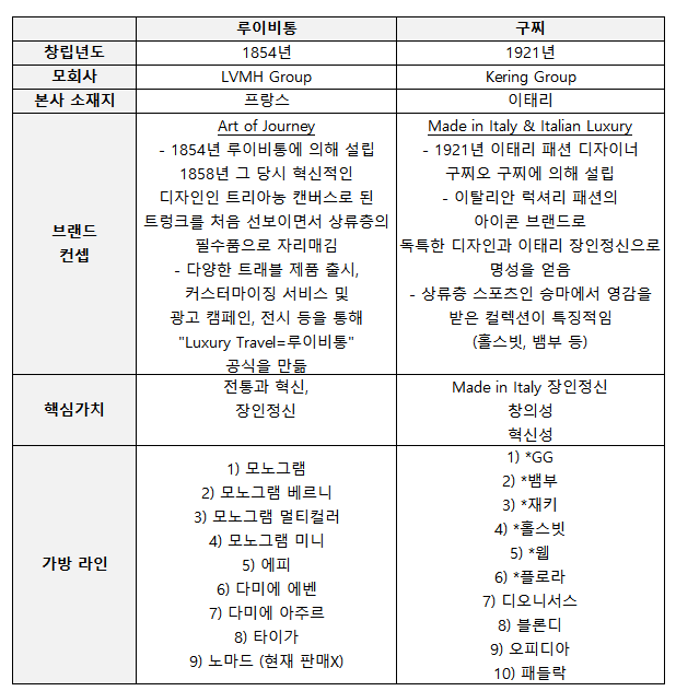 두 브랜드 모두 오랜 역사, 장인정신 + 창의성과 혁신성을 가장 중요한 핵심가치로 놓고 있지만 다른 점은 루이비통의 경우 "여행의 정신"을 강조하고 있으며, 구찌의 경우 "이탈리안 헤리티지 (패션/문화의 현대적 해석)"를 강조하고 있다는 점이다.