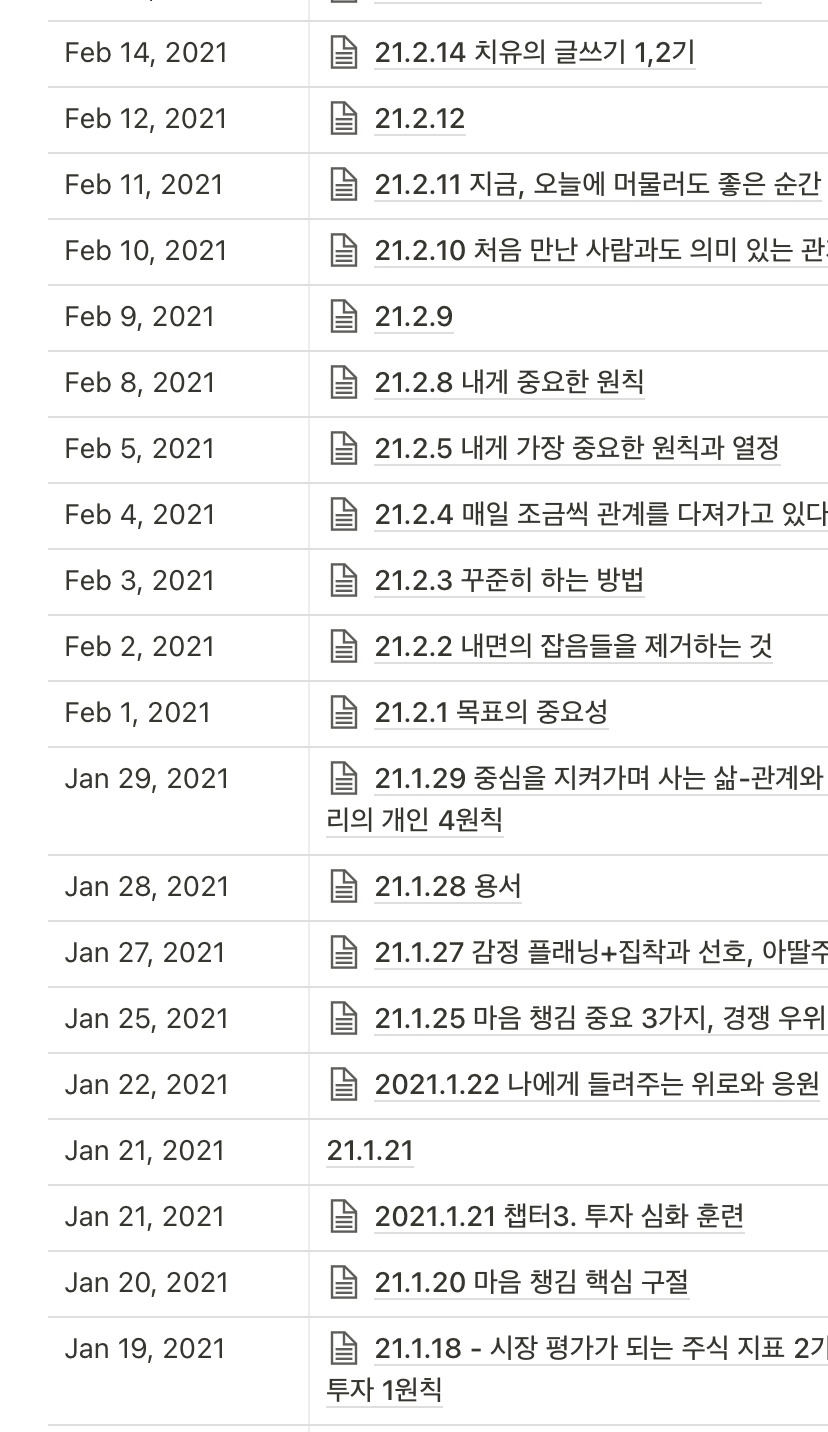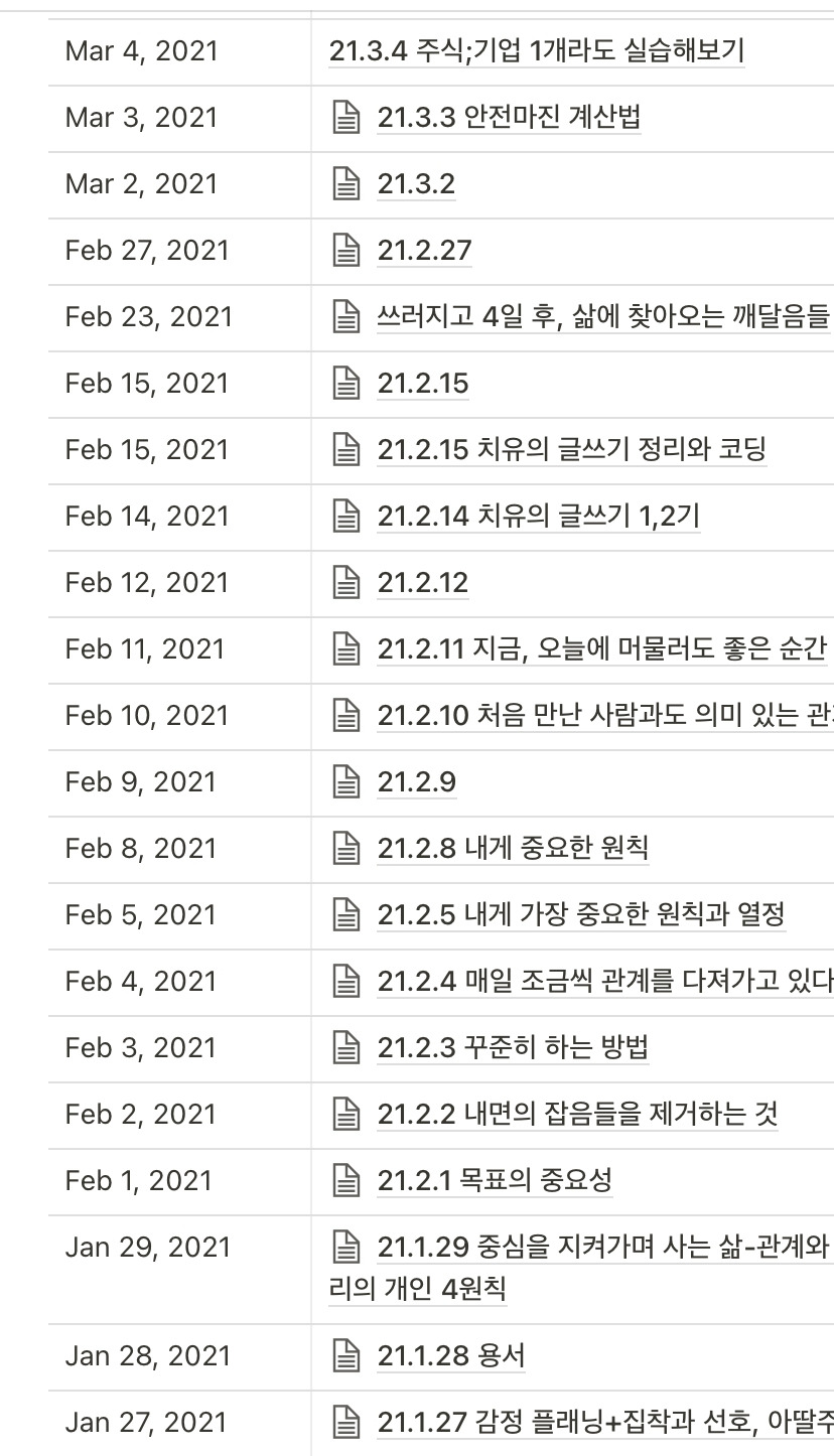 만들어진 시스템에 20일 정도 넘게 기록하셨나요? 그럼 축하드립니다. 환영합니다.. 이제 당신은 시스템의 노예(?).. 사람의 습관이 정착하기까지 50-100일 정도 걸린다던데요, 20일의 고비를 넘기셨다면 조금만 더 힘내 봅시다. 훨씬 쉽게 움직이고 기록하며 꾸준하게 앞으로 나아가는 스스로를 확인할 수 있습니다. 그렇게 조금 더 꾸준히 하시게 됩니다.