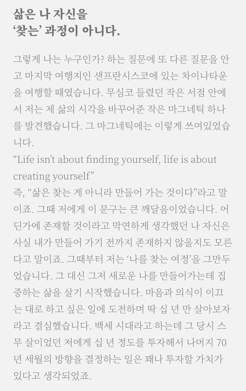 그런데 저 문구를 읽고 제가 지금까지 너무 과거에만 매여 있었던 게 아닐까 생각이 달라졌어요. 그때까지 아침마다 글을 쓰면서 저를 달래주거나 제 마음속 힘든 생각들을 끄집어내기도 할 때면 어김없이 감정적으로는 힘들 때가 많았거든요. 그런데, 아 나는 나를 찾는다고 끊임없이 스스로를 돌아보기만 했지, 내가 앞으로 만들어나갈 나날들에 대해서는 진짜 진지하게 고민해보지 않았구나 깨달았고, 제 스스로에게도 미안해졌어요. 그리고 저분의 저 글은 너무 좋아, 제가 다시 20살로 돌아간다면 좋을 텐데 하면서 남동생에게 전달해 줬죠.