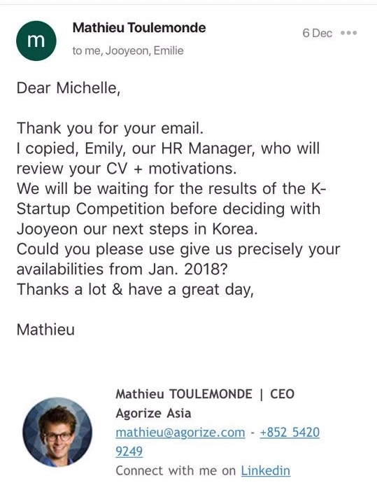 그리고 이렇게 사장님께 찾아가 뵐 수 있었던 과정은 하루아침에 이루어진 것이 아니었으니, 그 차근차근한 과정을 살짝 알려드리려 합니다. 그러니 앞으로 혹시 외국계 스타트업에서 일하고 싶으신 분, 혹은 한국의 스타트업이나 다른 어느 나라의 스타트업에서건 일하고 싶으신 분이 계시다면 저의 방법을 참고해 보셔요~ 특히나 스타트업은 업무 특성상 기회를 ‘찾는 자’를 반기니, 적극적이거나 능동적인 사람은 쌍수 들고 환영할 수밖에 없고, 이 글을 읽고 있으신 여러분은 이미 그런 능동적인 인재니까요 (찡긋)