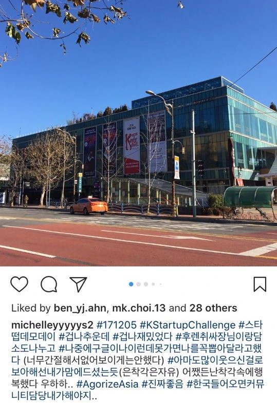 안녕하세요! 미셸입니다! 사실 어제 하루 종일 글을 쓰고 싶었는데, 다른 일들에 밀려 올리지 못한 기쁜 소식을 지금 당장 라잇 나우! 전하려 합니다! 그건 바로바로 가고 싶었던 세계적인 스타트업(홍콩 베이스의 급 성장중인 스타트업! https://www.agorize.com/en 구글, 유튜브, 우버, 아데코 외 굴지의 MNC들과 파트너십을 맺은... 곳...) 에서 제가 인턴 오퍼(?)를 받았다는 것인데요! (사실 아직 이 스타트업은 한국 지부가 생기기 전이라, 내부 결정에 따라 지부가 생긴 후에야 제가 일할 수 있게 되기에 좀 더 기다려야 하는 상황 이기는 합니다^^그래서 저는 아직 더 많은 곳들에 이력서를 넣고 면접을 보러 다녀야 하긴 하지요....하하) 하지만..!! 놀랍게도 그 스타트업은 이틀 전에 제가 스타트업 챌린지에 다녀오고 이런 인스타그램을 남겼던 때의 스타트업이었습니다!
