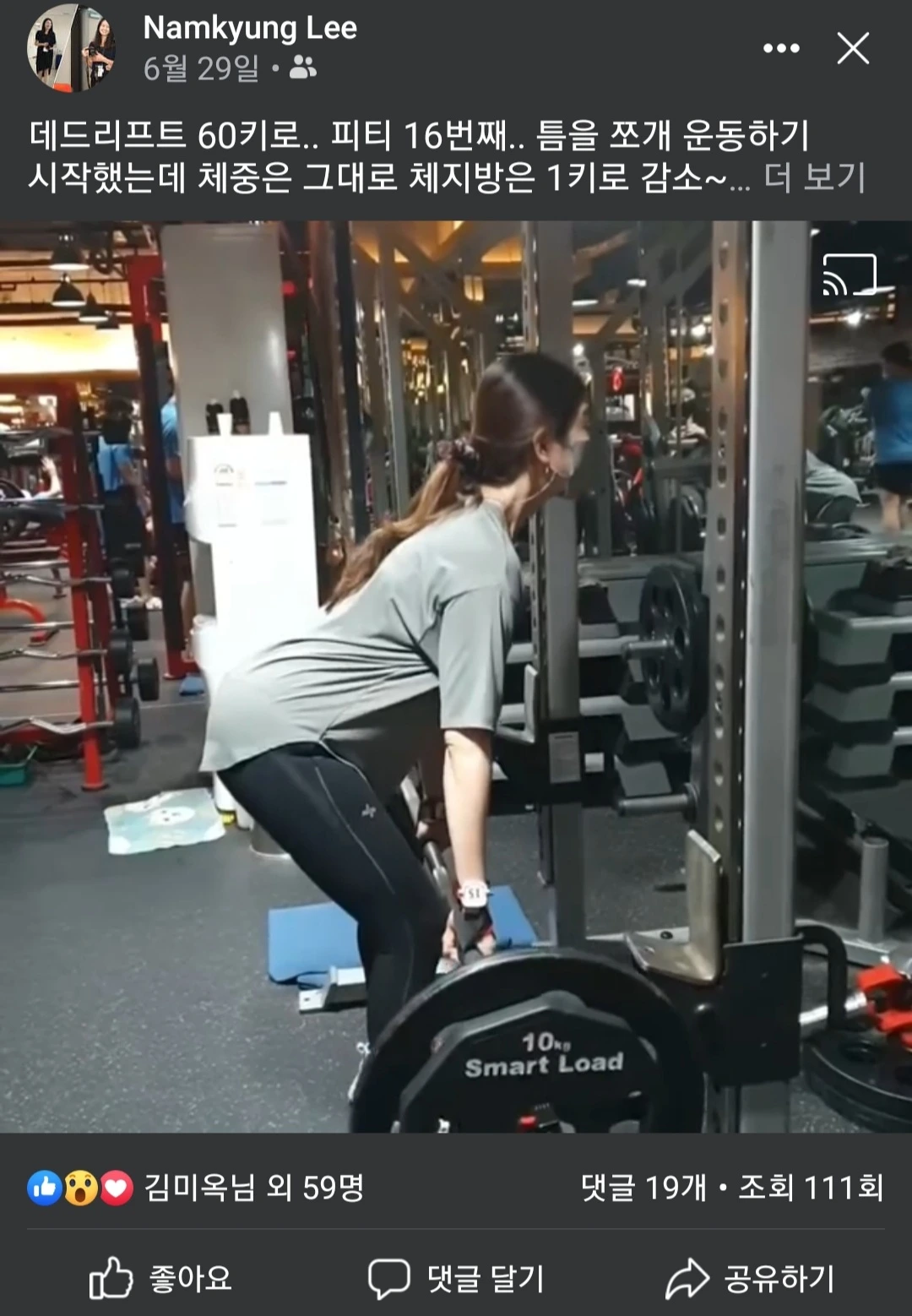 한 달 후쯤 BMI 지수 검사를 했더니 체지방만 1kg이 빠지고 몸무게는 그대로다. '정말 몸무게는 안 빠지는구나(식이요법 안 하고 해서 큰 기대도 안 했지만, 예전에 비해서는 정말 몸무게 변화가 없다).' 트레이너가 찍어 준 데드리프트 동영상을 페이스북에 올렸더니 댓글이 웃기다.