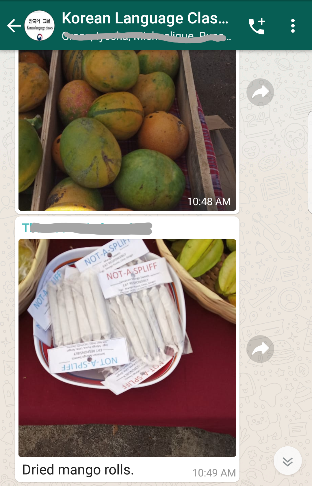 요즘 망고에 푹 빠진 나는, (실은 줄리 망고(Julie mango)에 푹 빠진 나는) 학생들에게 망고의 종류와 맛에 대해 여러 가지를 질문했다. 그중 한 학생 T가 토요일에 오가닉 마켓에 엄마를 도우러 간다고 했고, 당일, 학생은 망고 축제 정보며 마켓의 망고 등을 찍어 보냈다.