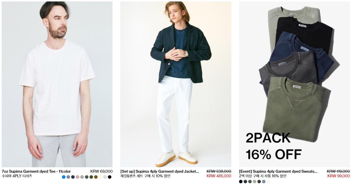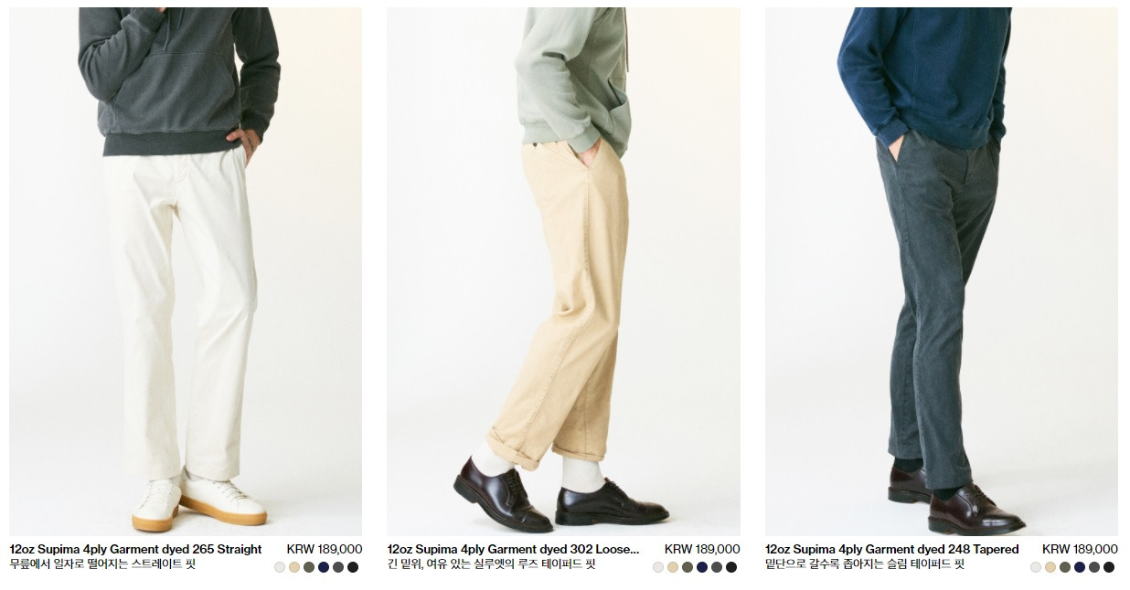 무엇보다 가먼트 다잉 기법을 전문으로 하는 브랜드에 비해 가격대가 다소 낮은 것도 큰 경쟁력 중 하나입니다. 팬츠는 20만원 이하, 이너는 10만원 정도로 책정되어 있어 가먼트 다잉이라는 고급 기법을 어렵지 않게 경험하기에는 좋습니다.