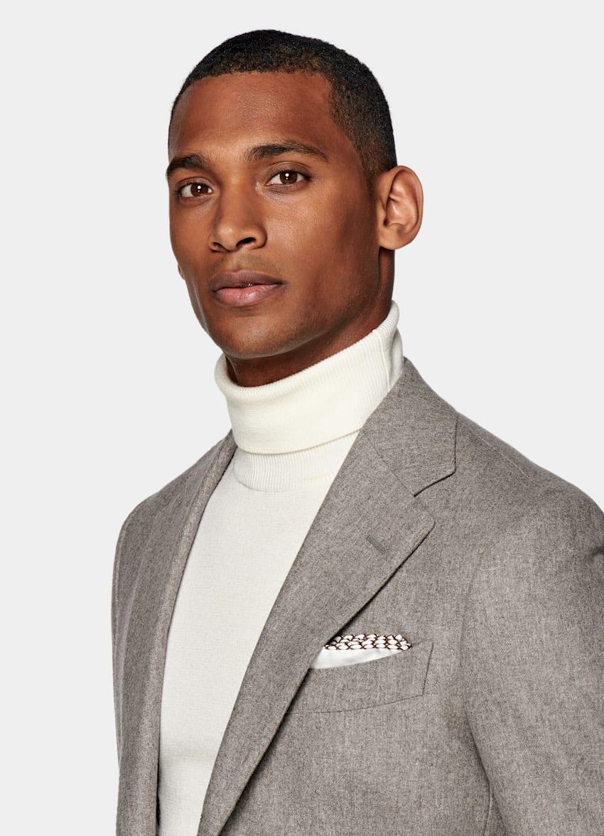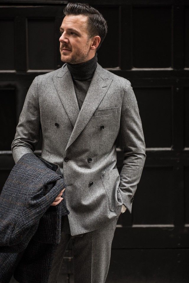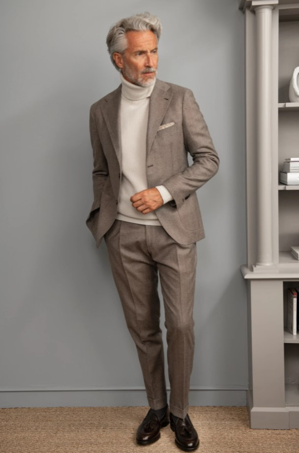 무엇보다 잘 어울리는 조합은 터틀넥입니다. 오로지 겨울에만 만들 수 있는 조합인 플란넬 슈트와 터틀넥은 따뜻함과 정중함이 묻어있는 스타일입니다. 컬러는 어떠한 것을 선택해도 잘 어울리는 조합입니다만 최상의 컬러는 존재합니다. 아이보리, 블랙, 챠콜입니다. 아이보리는 어떠한 컬러와도 조합이 좋습니다. 착용만으로도 사람을 따뜻하고 부드러운 느낌을 만들어주기 때문에 밝은 컬러의 플란넬 슈트와는 최고의 조합입니다. 블랙과 챠콜은 라이트 브라운이나 네이비와 잘 어울리는데 밝은 베이지와는 쉽지 않은 조합이 될 수 있습니다. 그렇기에 꼭 시험 삼아 스타일링해보는 것을 추천합니다.