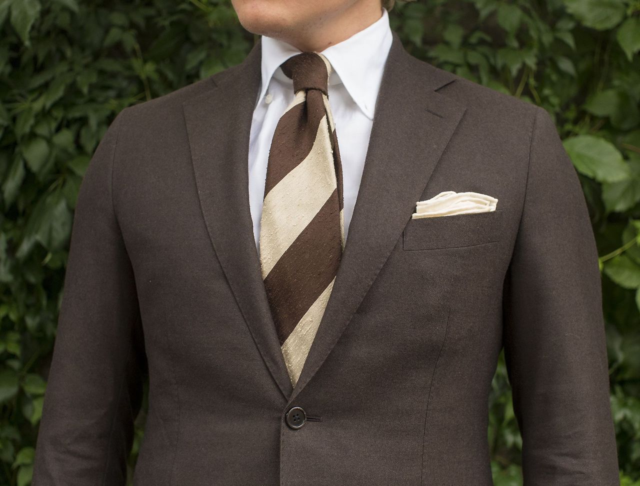 밝은 컬러의 슈트를 입을 때 이너는 선택의 폭이 다양해집니다. 셔츠의 컬러는 화이트를 기본으로 블루도 잘 어울리는 한쌍이 됩니다. 베이지, 라이트 브라운, 네이비까지 모두 화이트, 라이트 블루, 블루 셔츠와 융합이 좋습니다. 타이는 이보다 한 톤 낮은 걸로 선택하거나 슈트 소재의 바탕 컬러와 톤을 맞추면 세련된 스타일을 만들 수 있습니다.