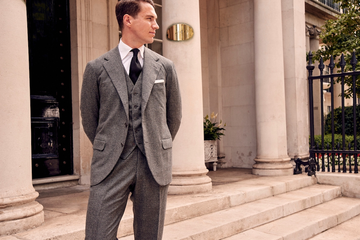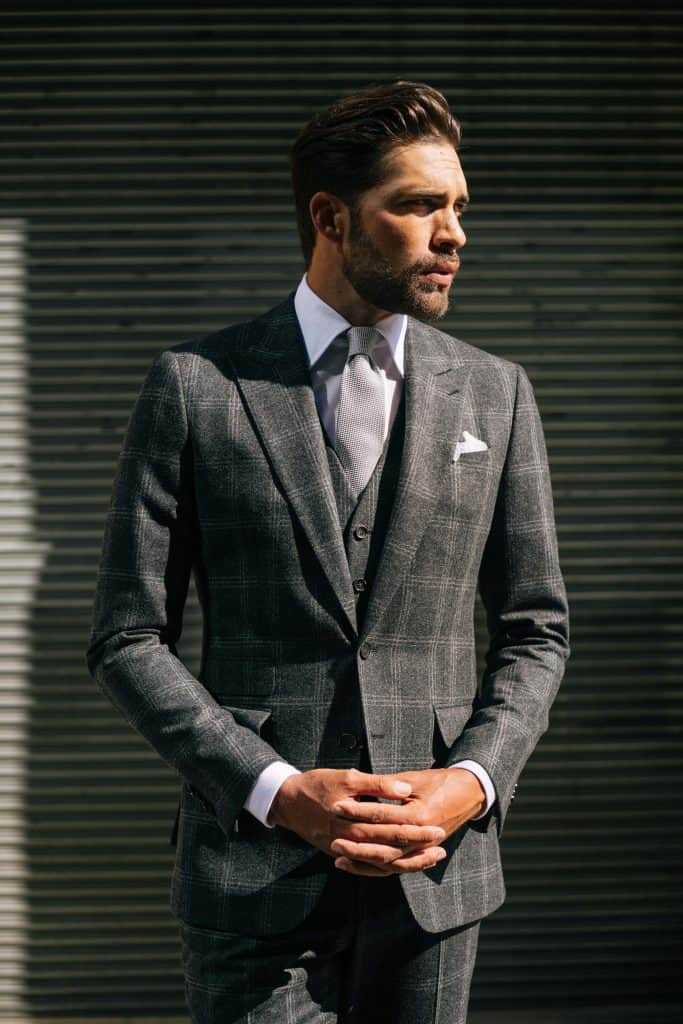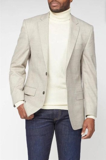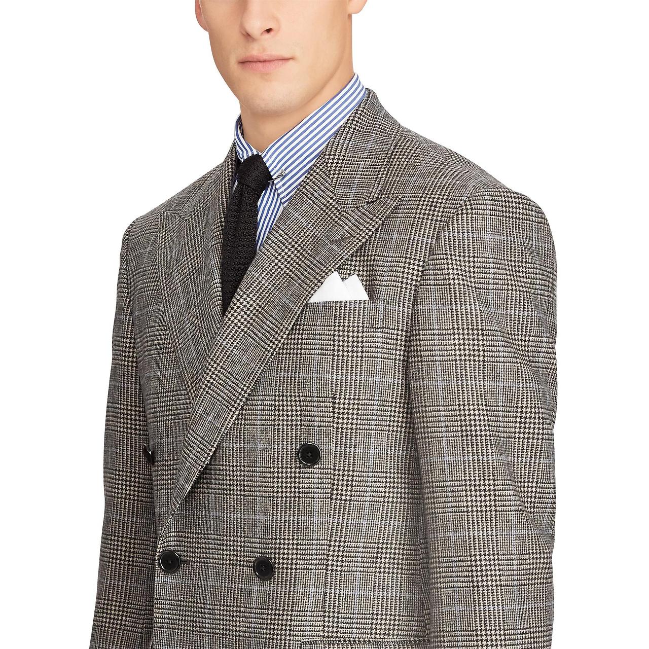 밝은 컬러의 슈트를 선택할 때 더 과감한 걸 시도해보고 싶다면 패턴, 그중에서도 글랜 체크를 추천드립니다. 한 톤 진하게 올라간 체크 물은 은은하게 표면을 덮으면서 솔리드 못지않은 매력을 보여줍니다. 포멀함보다는 캐주얼한 느낌을 강하게 보여주는데, 이런 성향으로 셔츠를 보다 캐주얼하게 혹은 스웨터의 컬러를 보다 다양하게 선택할 수 있다는 장점이 있습니다. 무엇보다는 재킷 하나만 활용할 때, 비슷한 재질의 울 트라우저(팬츠) 외에도 데님 팬츠에도 훌륭한 조합을 보여준다는 점에서 한 벌로 다양하게 활용 가능하다는 장점이 있습니다.