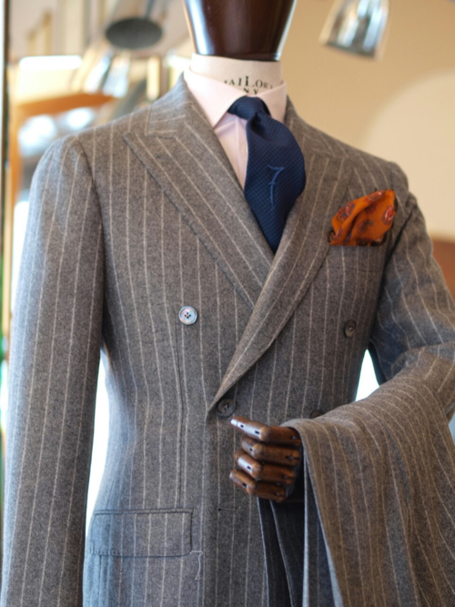라이트 그레이의 매력은 따뜻함과 차가움의 가운데에 있는 것입니다. 어느 한 곳에 치우치지 않아 슈팅으로도 캐주얼로도 활용 가능한 컬러감은 독보적입니다. 베이지와 브라운이 포멀 한 느낌이 덜한 반면 라이트 그레이트는 포멀함과 캐주얼함 둘 다 가진 컬러입니다. 라이트 그레이와 플란넬 소재가 만나면 진중한 느낌이 강합니다. 이런 컬러의 특징으로 인해 디자인을 싱글 외에 포멀 한 더블 브레스티드 디자인으로 많이 사용되는 편입니다. 포근한 포멀 함이라고 해야 할까요? 무척 매력적인 컬러입니다.