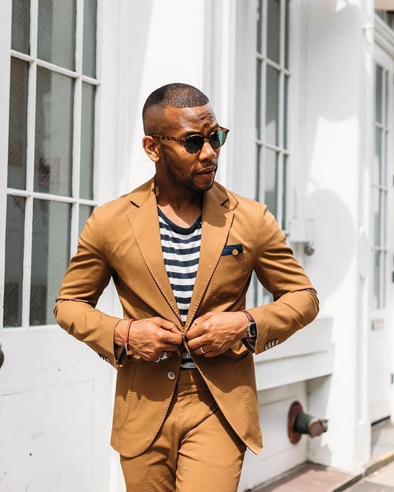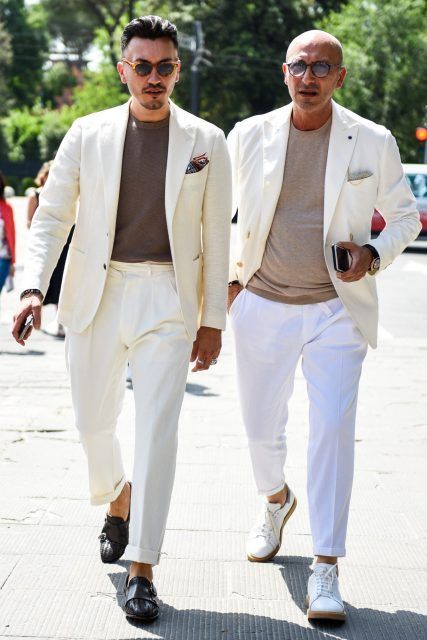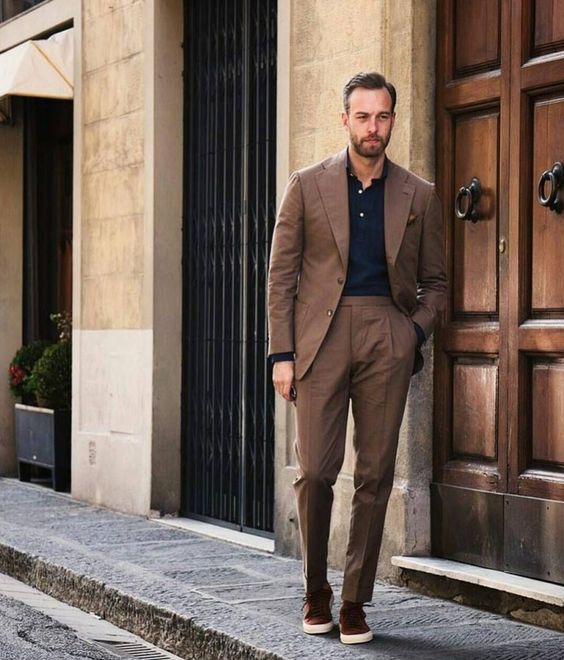 타이를 하지 않는다면 과감하게 셔츠를 2개 이상 풀어도 좋습니다. 위에서 언급한 것처럼 멋을 내기 위한 슈트이기에 셔츠 또한 다소 멋을 부리는 것이 좋겠습니다. 셔츠 혼자 다소곳하면 재미가 없을 테니까요. 셔츠가 아니라면 라운드 니트, PK 카라 니트도 좋은 조합입니다. 최근 들어 '셋업(SET-UP)'이라는 아이템으로 불리며 슈트 대용으로 화섬 소재 (폴리에스테르, 나일론 같은 인위적으로 만들어진 소재를 통칭하는 용어)를 활용해 비즈니스 캐주얼을 대표하는 스타일이 있습니다. 셋업에는 셔츠가 어울리지만 특히 니트류가 잘 어울려 반팔 니트를 입어야 하는 여름까지 꾸준하게 착용할 수 있는 아이템입니다. 코튼 슈트는 셋업보다는 더 클래식하지만 캐주얼한 느낌이 강하며, 여름보다는 봄/가을이 잘 어울립니다. 하지만 두 아이템 모두 캐주얼한 스타일임에는 분명하기에 니트류와 함께 입기에 좋은 아이템입니다.