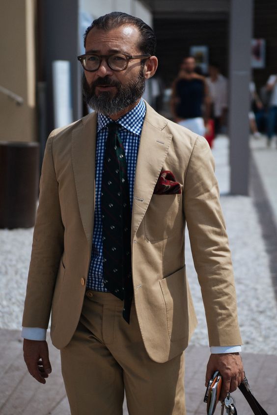 타이를 한다면 셔츠는 솔리드 화이트와 블루, 그리고 스트라이프, 체크 패턴까지 다양하게 활용하기 좋습니다. 베이지, 아이보리 같은 밝은 컬러라면 화려한 패턴의 셔츠는 좋은 조합이 됩니다.