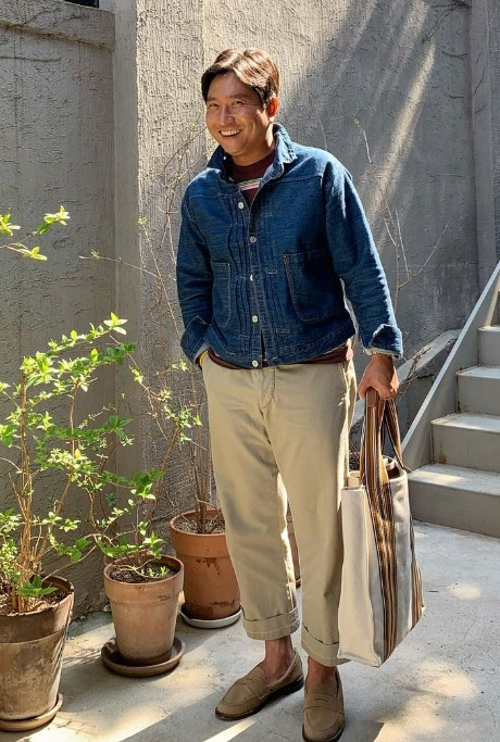 통이 넓은 팬츠, 낮은 굽의 스니커즈 등 어찌 보면 커 보이지 않는 아이템을 착용하여 편안하게 자신의 단점을 드러내는 그의 스타일은 오히려 여유 있어 보입니다. 특히 다양한 핏의 데님 팬츠 스타일은 길어 보이는 것보다는 데님 팬츠 자체가 가진 핏의 재미를 보여주기 위함입니다. 그의 이런 노력은 재밌고 근사한 캐주얼 스타일을 만들어 내는데 한몫합니다.