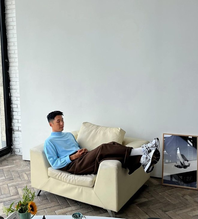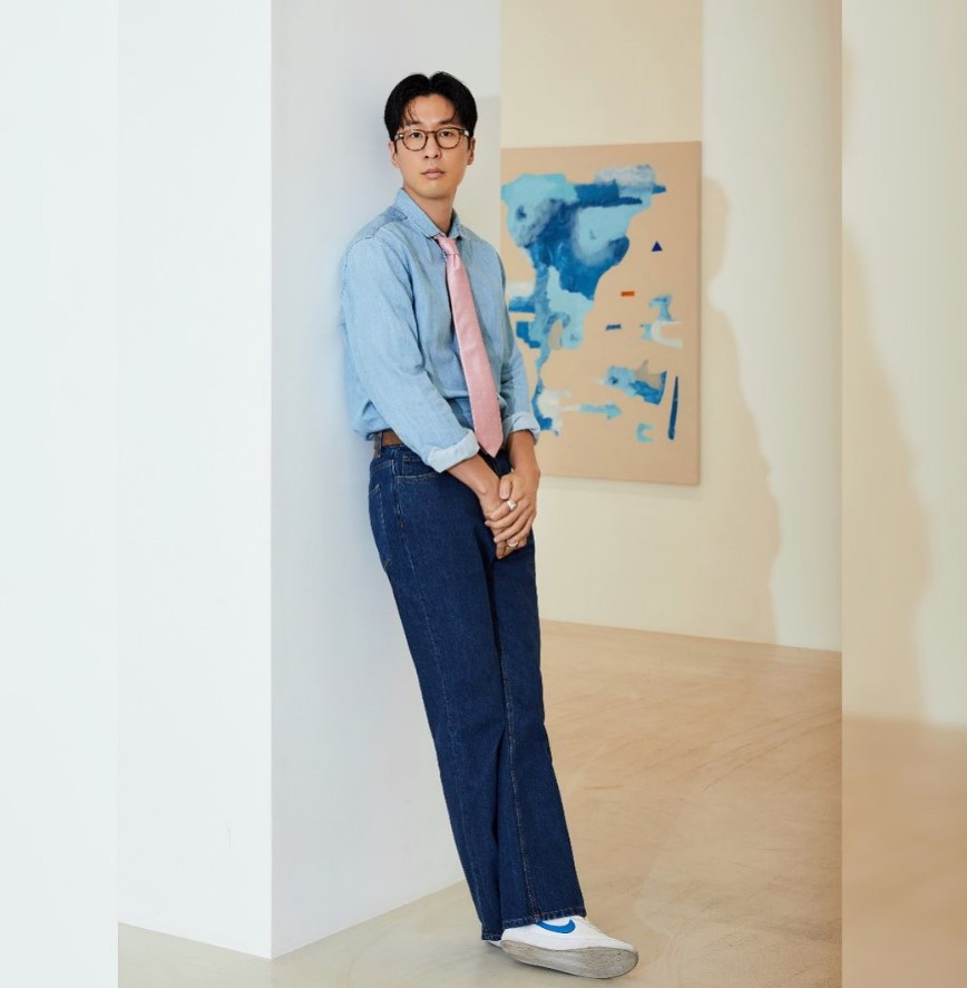 마이큐는 셔츠를 다양한 방식으로 입습니다. 캐주얼 데님 셔츠를 타이와 함께 매칭하여 정중한 캐주얼을 표현하기도 하고 (사진 왼쪽), 화이트 셔츠의 단추를 많이 풀어 여유로운 캐주얼을 만들기도 합니다. (오른쪽 사진) 어떤 아이템이든 자신의 방식대로 표현하는데 바로 '여유로움'입니다. 그 여유로움은 넉넉한 품에서 만들어집니다.