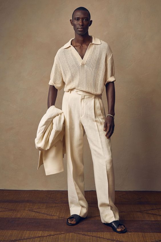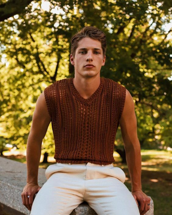 로우 게이지의 니트는 보통 가을 겨울에 많이 쓰지만 성글게 편직 한 여름성 니트가 최근 많이 보이고 있습니다. 특히 여성들이 많이 입던 형태의 로우 게이지 니트가 남성복에서도 다양한 조직과 컬러, 디자인으로 제안되고 있습니다. 과감한 캐주얼을 즐기는 남성들의 니즈(Needs)에 맞게 제안되는 다양한 로우 게이지 니트는 다소 노출을 해야 하지만 그것만으로도 충분히 멋스러운 느낌입니다. 다만 도심 안에서 로우 게이지 니트만 입고 다니기에는 부담이 될 수 있으니 (입는 사람이 아닌 보는 사람들이 부담스러울 수 있습니다.) 지난번 추천드린 슬리브리스 탑을 함께 착용하는 것이 좋겠습니다.