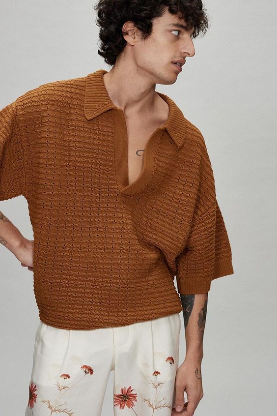 로우 게이지 니트 아이템 중 가장 접근성이 좋고 스타일리시한 것은 PK 카라 니트입니다. 아래 사진처럼 무겁게 짜인 니트를 늘어뜨리는 방식으로 여유로운 스타일을 만들 수 있습니다.