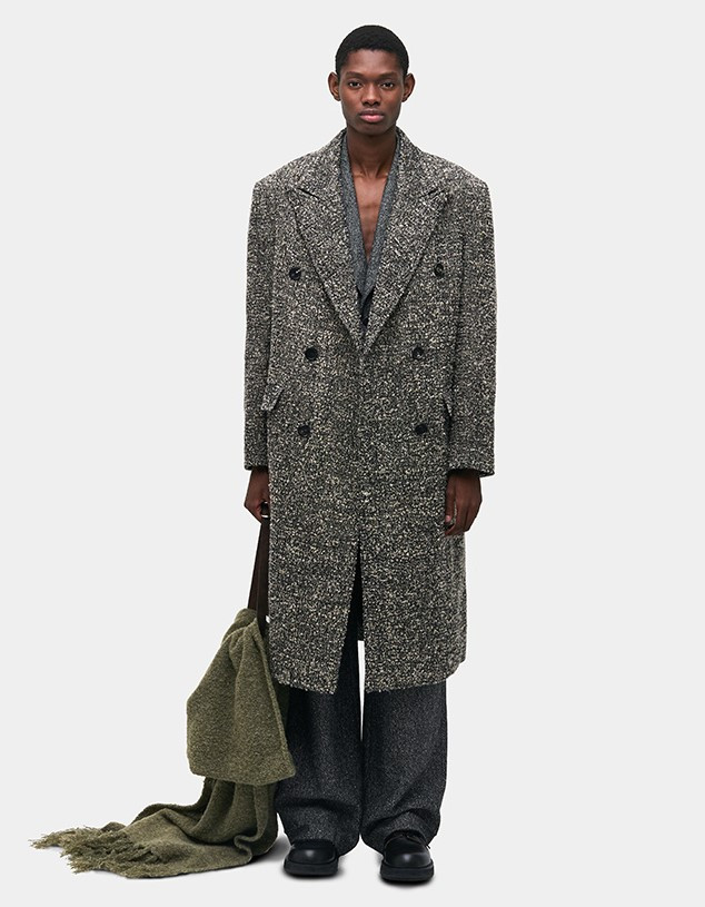 이 쿠어 코트는 슈트 위에 입어도 될 만큼 디자인이 포멀 합니다. 더블 브레스티드 디자인에 단단한 어깨, 긴 기장으로 묵직하면서도 휘날리는 멋이 있는 아이템입니다. 미니멀한 슈트 차림 위에 걸쳐주면 포인트가 됩니다. 캐주얼 스타일에서는 적당한 포멀과 함께 소재가 주는 재미가 캐주얼을 더욱 살려줍니다.