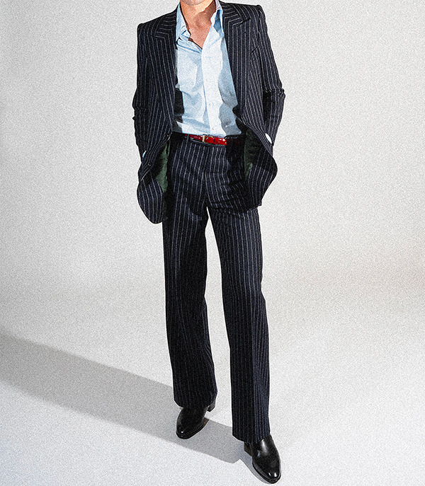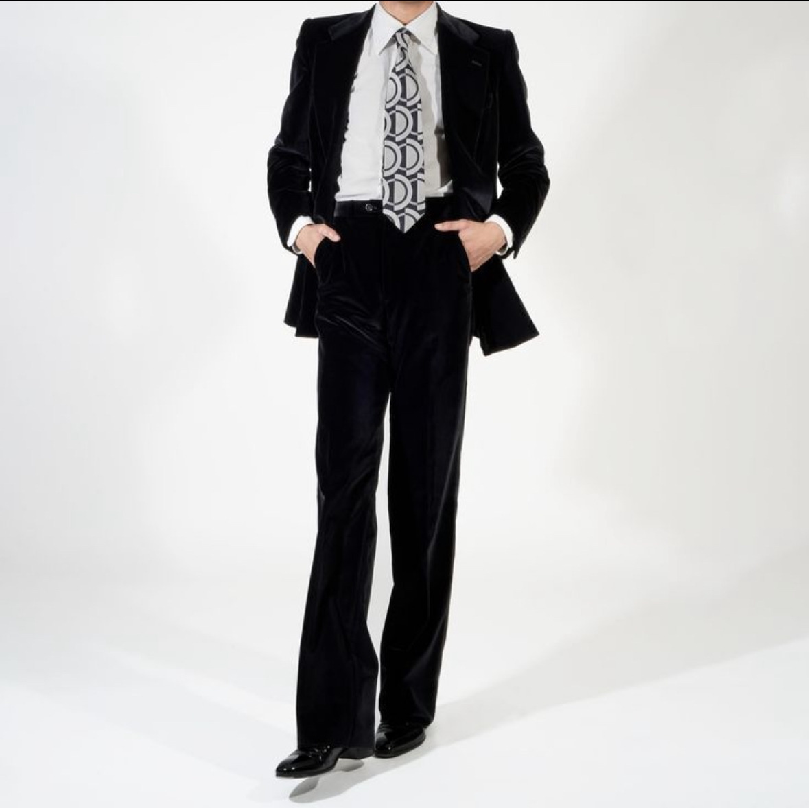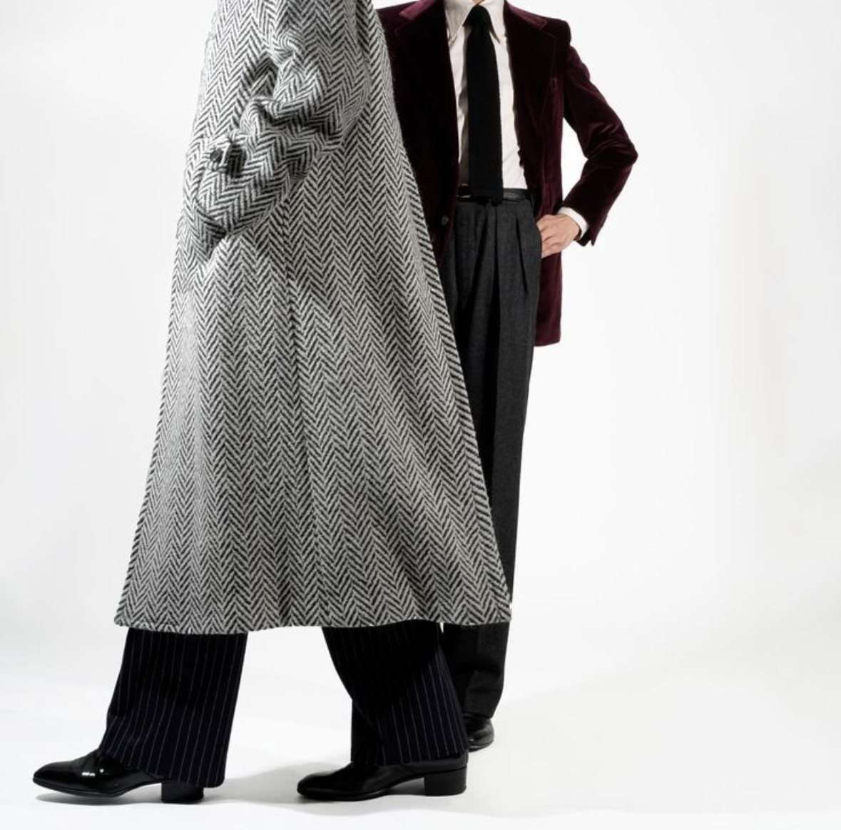 허즈밴드 파리스의 재킷은 대부분 긴 기장으로 디자인되어 있습니다. 이는 영국풍 슈트, 특히 '에드워드 색스턴'이라는 브랜드에서 영향을 받았습니다. 톰 포드가 참조했던 브랜드이기도 한 에드워드 색스턴은 특유의 긴 기장과 넓은 피크드 라펠, 통 넓은 팬츠로 유명한 브랜드입니다. 본연의 색이 강한 브랜드입니다.